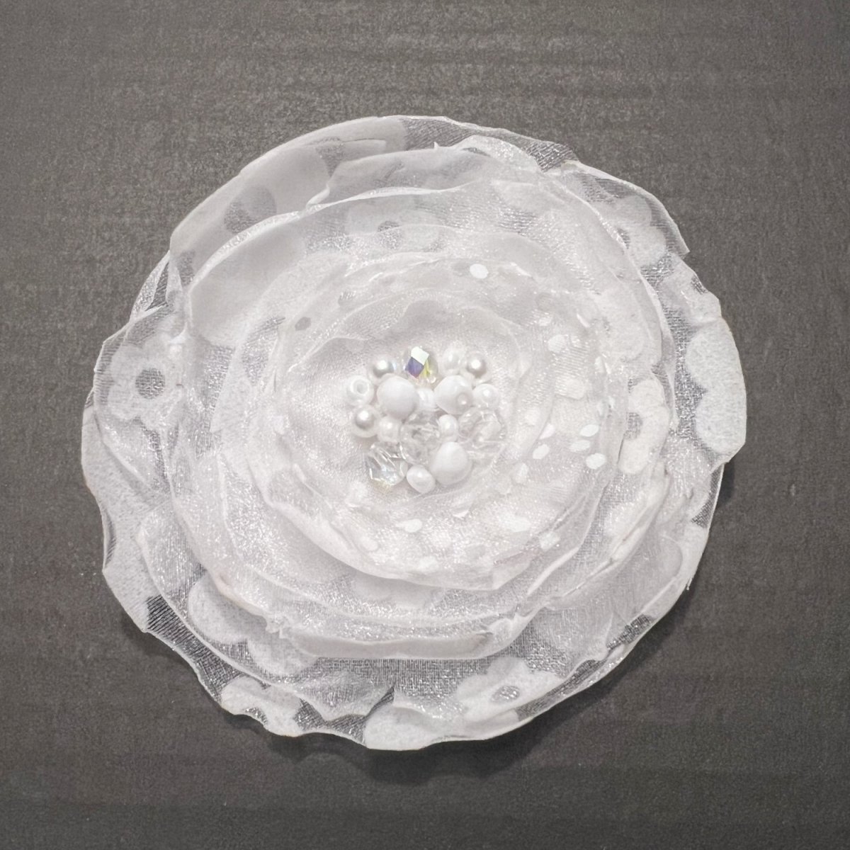 Organzová brož se středem pošitým korálky. Průměr brože cca 10 cm, brožové zapínání.
