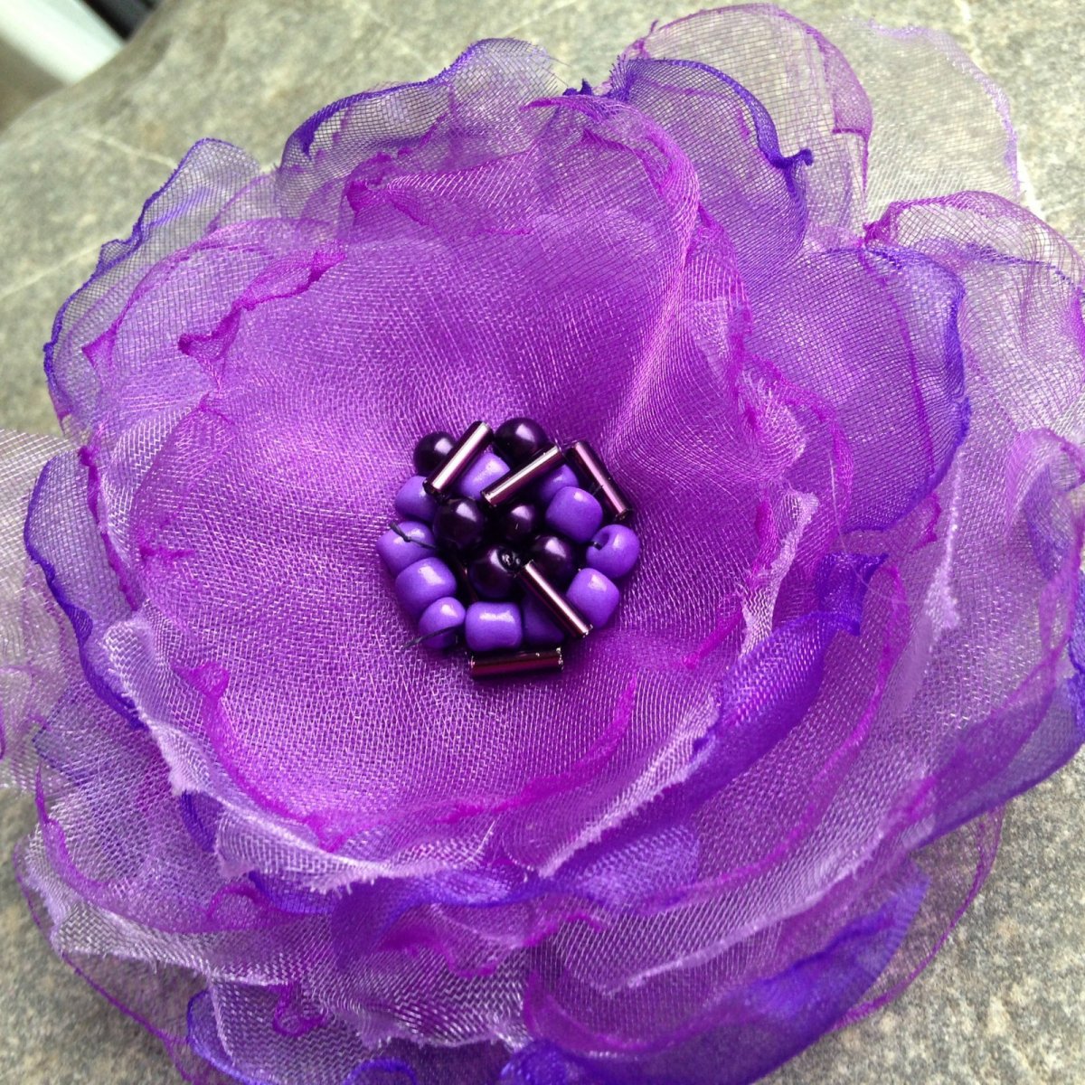 Organzová brož fialové barvy. Střed brože je vyšitý voskovanými korálky a rokajlem. Průměr brože cca 9 cm, brožové zapínání.