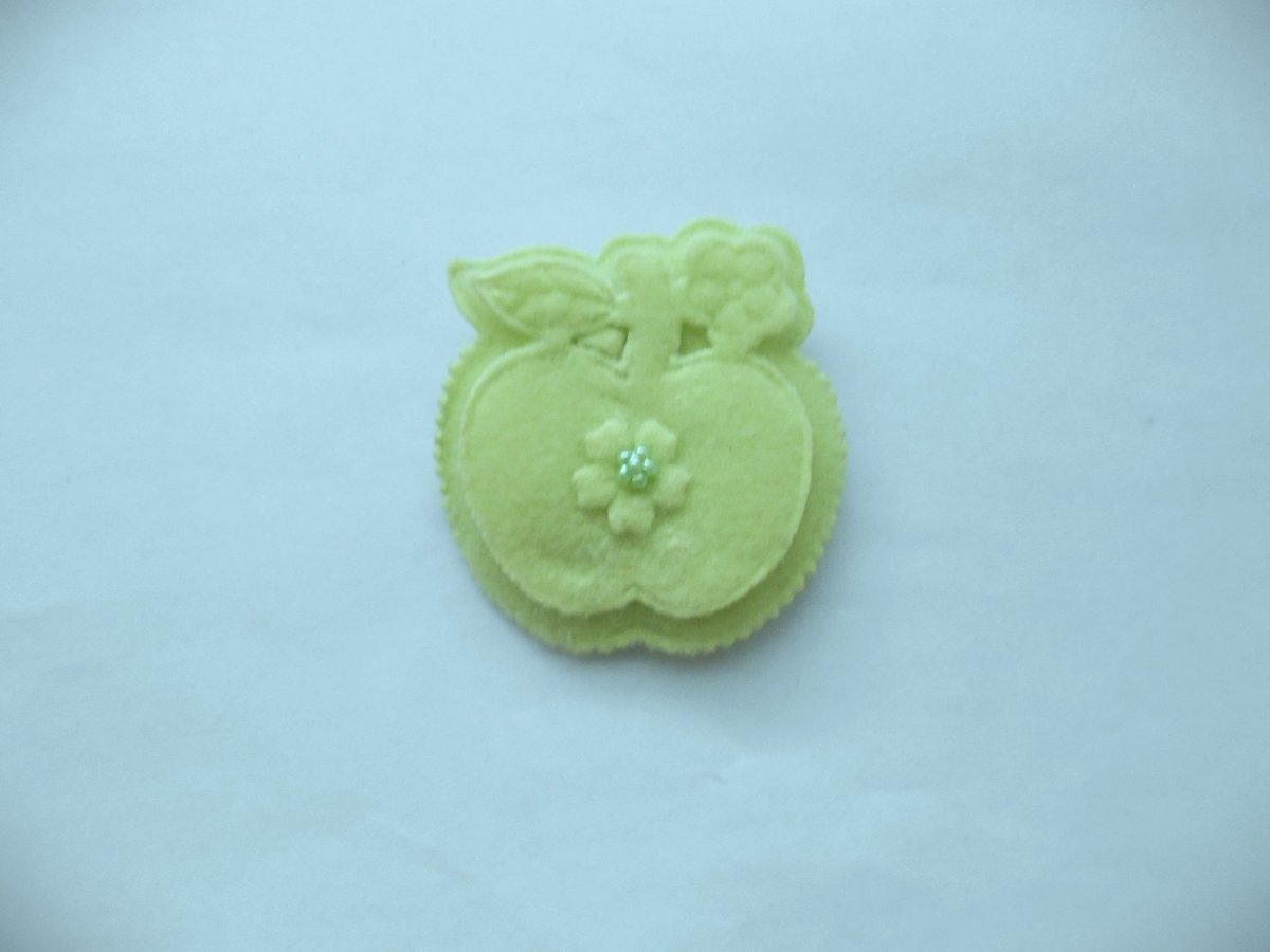 Textilní brož jablko: výška 5 cm, šířka 5 cm, celá brož je zespodu podlepená - zpevněná riflovinou, na kterou je připevněn brožový můstek z bižuterního kovu, brože nemusí zdobit jen oděvy, ale i kabelky, batohy nebo domácnost.