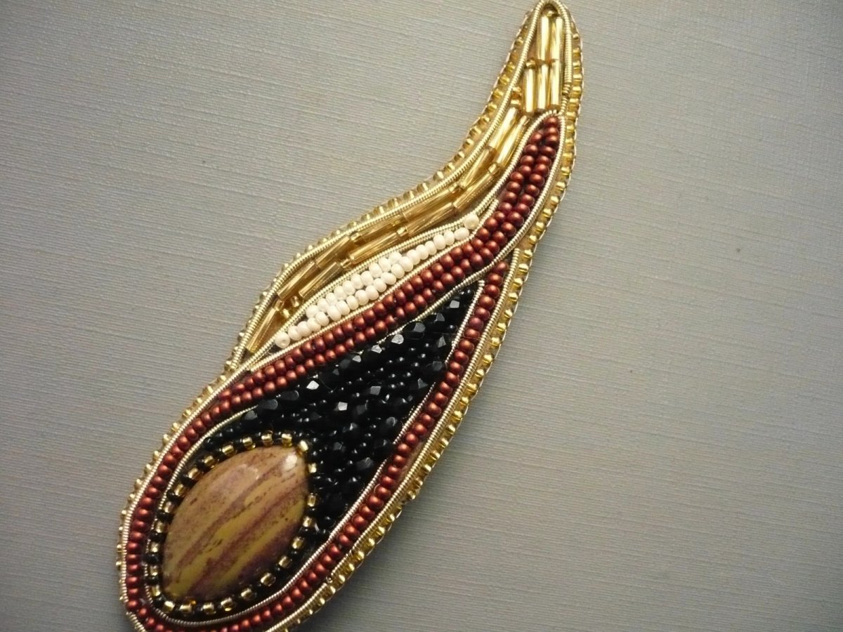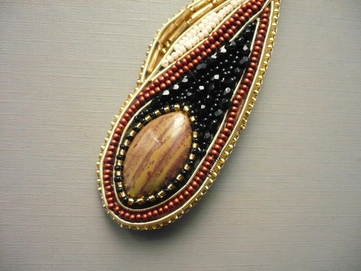 Ručně šitá brož z kvalitních rokajlových korálků Preciosa. Základem je kabošon jaspisu imperial, podložený hnědou plstí a obšitý korálky. Rozměr 105 x 33 mm. Na zadní straně je zavírací brožový špendlík (můstek), pomocí kterého lze brožku umístit na kabát, svetr či kabelku..