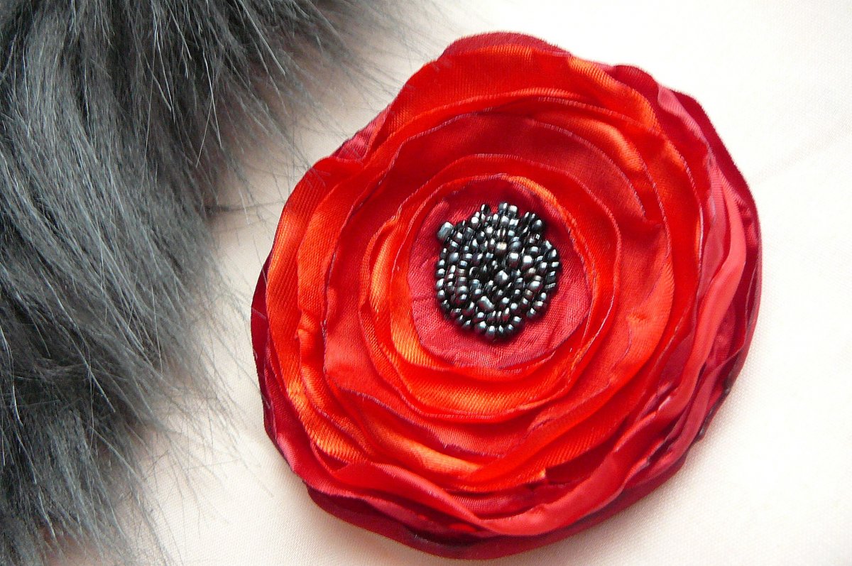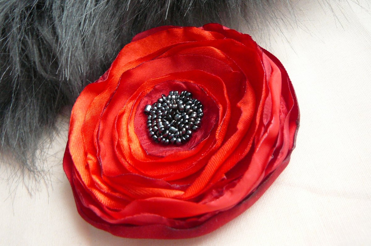 Lehká brož, ušitá z různých látek červeno-vínové barvy, velikosti 8,5 cm. Zapínání na spínací špendlík.