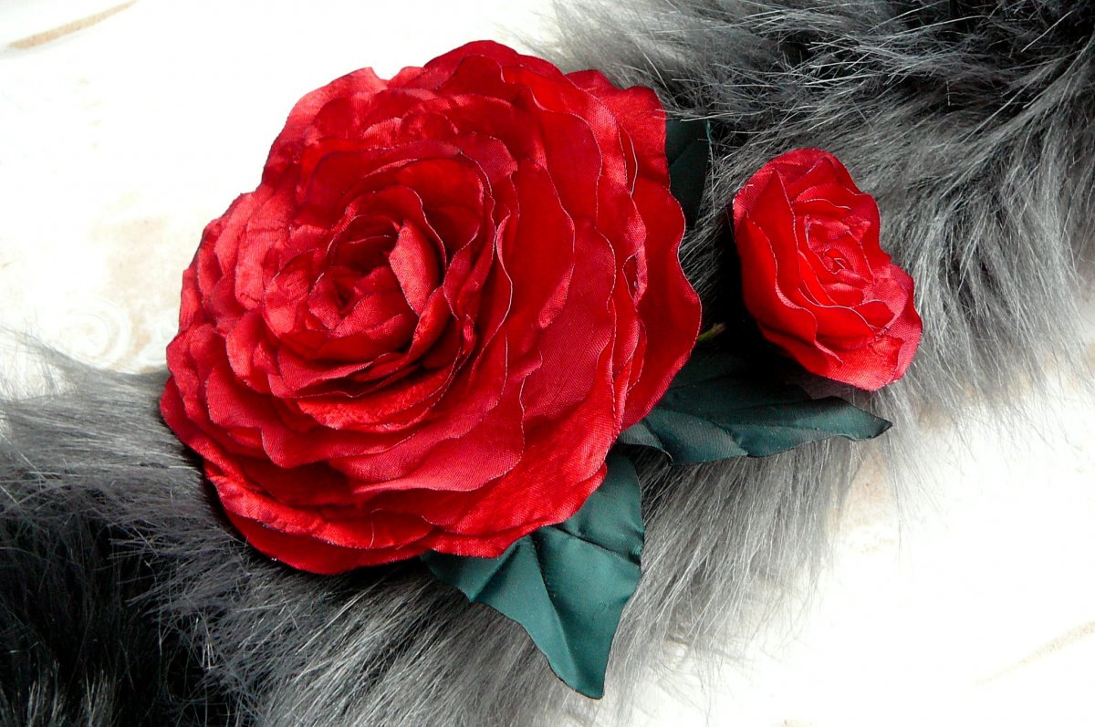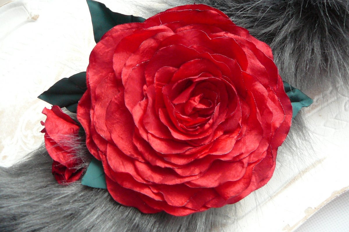 Tato brož ze dvou vínových růží s přidanými lístky představuje velice elegantní akcent pro romantickou ženu, jež si přeje zanechat dojem.