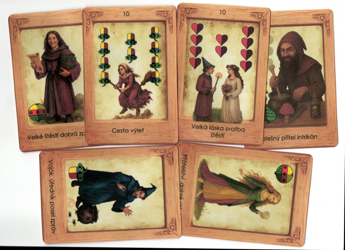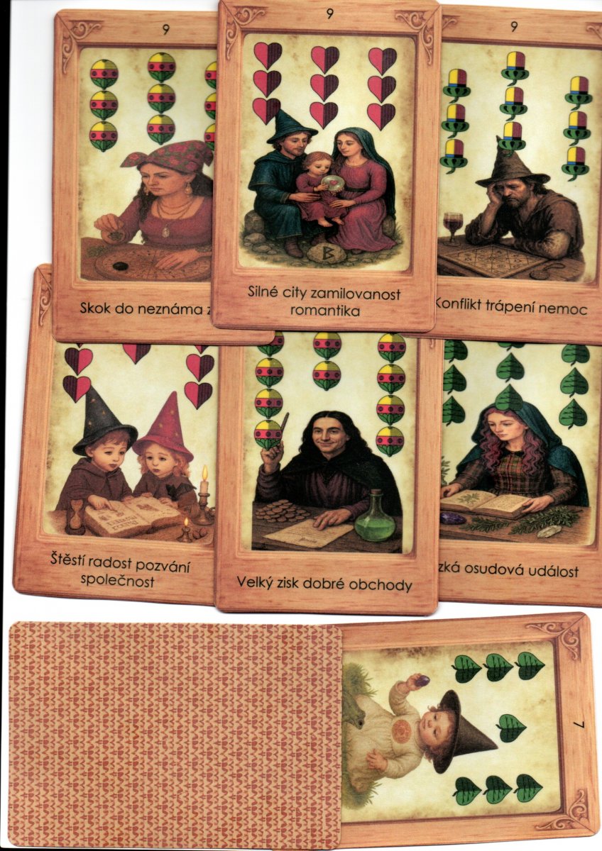 Mariášové karty ČARODĚJNICKÝ SVĚT 32karet s ilustracemi čarodějníc a kouzelníků pro milovníky magie a tajemna , jako vykládací mariášové karty s popisem významu vel: 7,8X11,7cm ruční práce tisk na papír 250g, přelakováno nezávadným lakem pro pevnost a lesk .