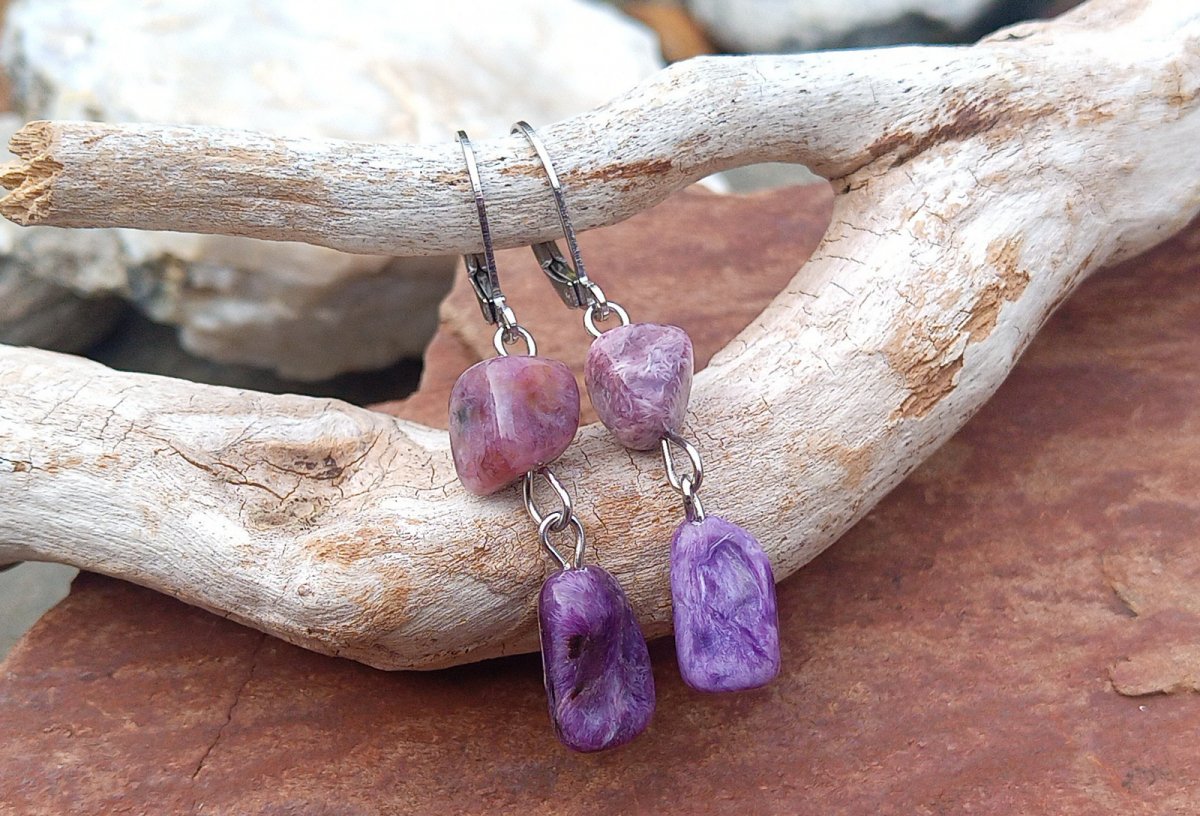 Tromlovaný čaroit o velikosti cca 13 a 8 mm v náušnicích zavěšených na zavíracích háčcích z chirurgické oceli - hypoalergenní, vhodné i pro alergiky. Elegantní náušnice vhodné ke každé příležitosti. Čaroit je nádherně vybarvený. Každý kámen je svým tvarem a velikostí originál