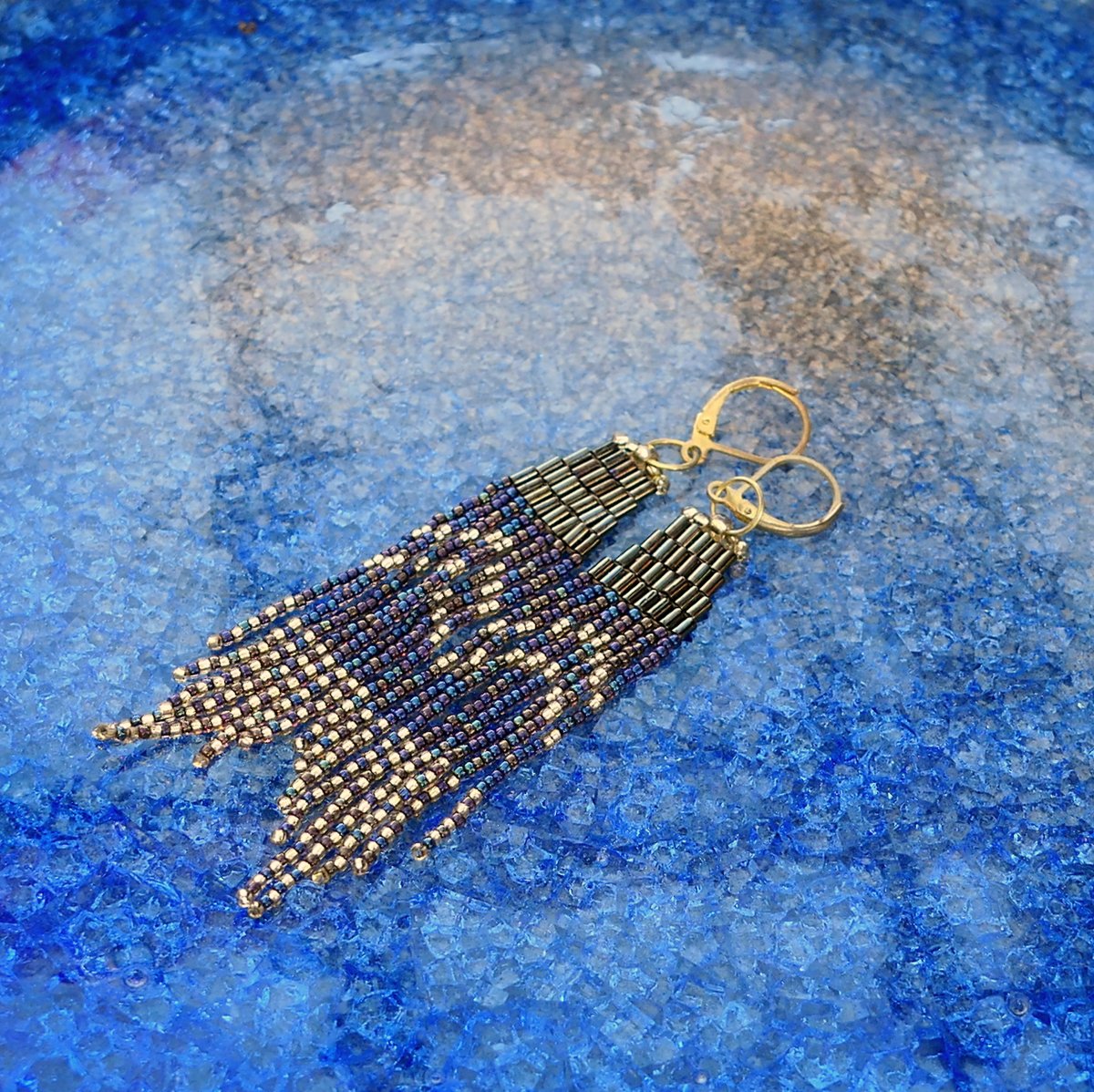 Dlouhé třásňové šité náušničky šířky 1,3 cm, zavěšené na uzavřených háčcích z obecného kovu bez niklu v barvě zlaté. S korálkovými třásněmi mají náušničky bez háčků délku 6,5 cm.