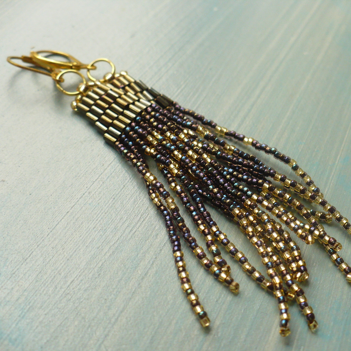 Ušito z japonského rokailu nejmenší velikosti v barvě fialové a zlaté a drobných trubiček v hnědé barvě s krásným leskem.
