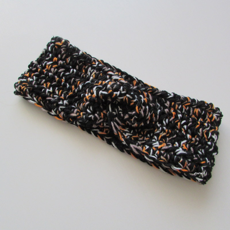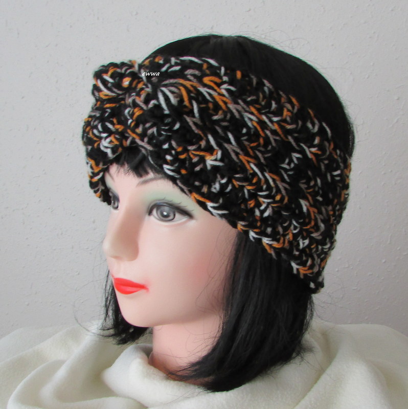 Háčkovaná hřejivá čelenka, široká cca 10 cm,