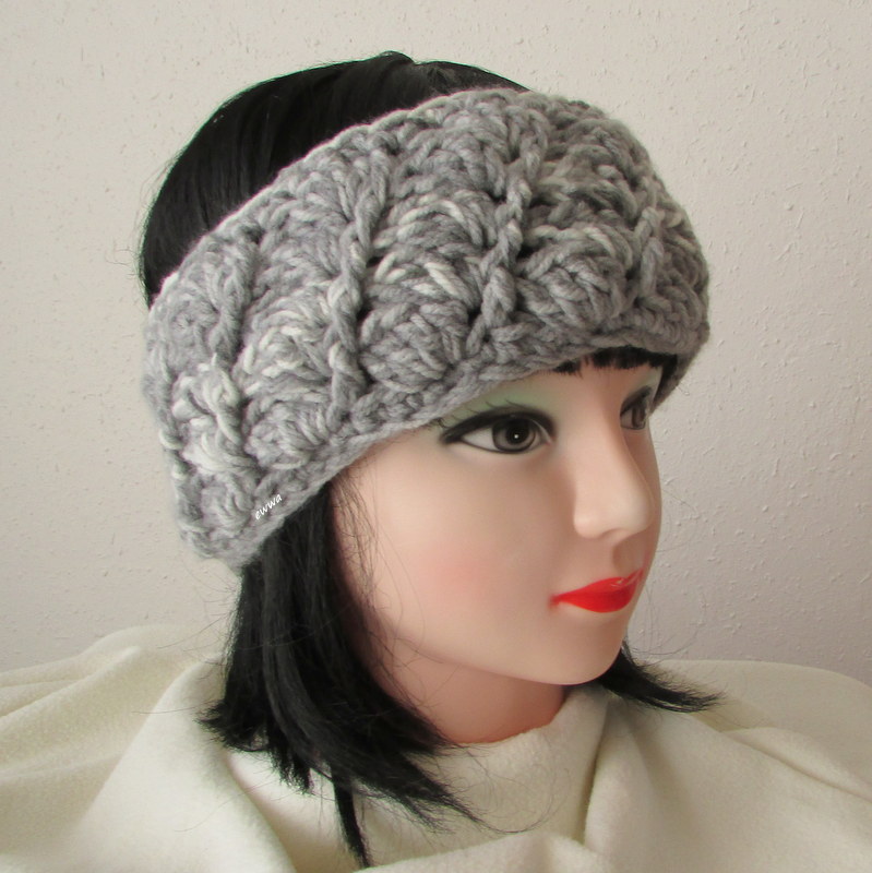 Háčkovaná hřejivá čelenka, široká cca 10 cm,