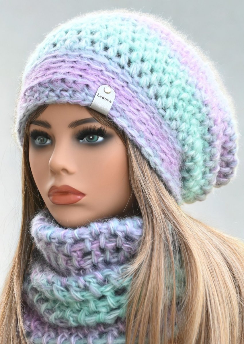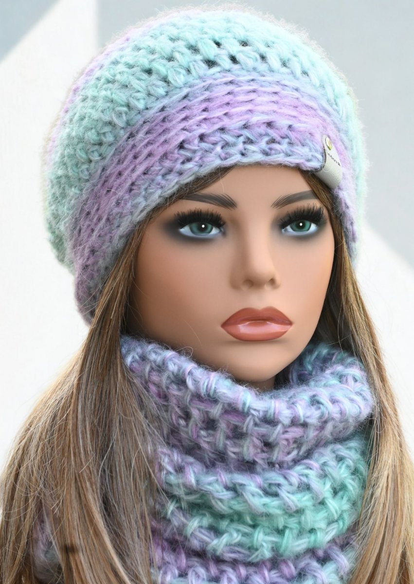 Háčkovaná souprava čepice s nákrčníkem z lehoučké nadýchané chlupatkové příze v krásných fialovo-mátových barvách.