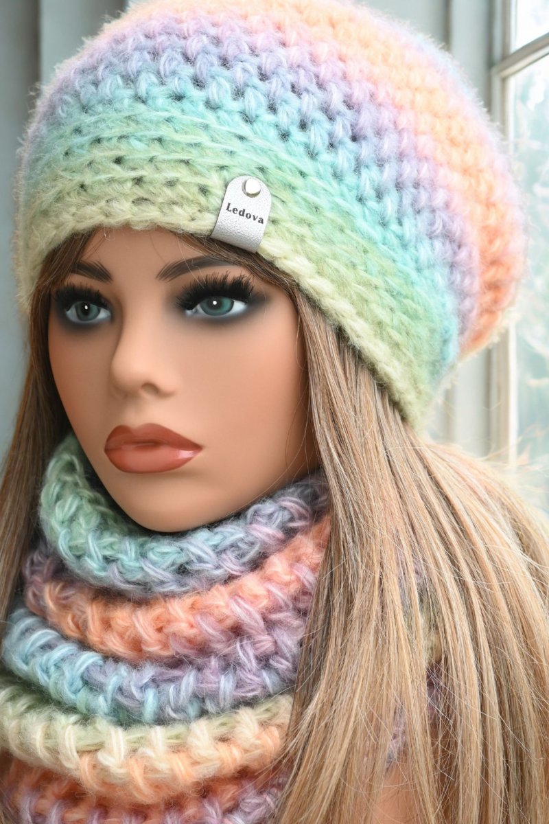 Háčkovaná souprava čepice s nákrčníkem z lehoučké nadýchané chlupatkové příze .