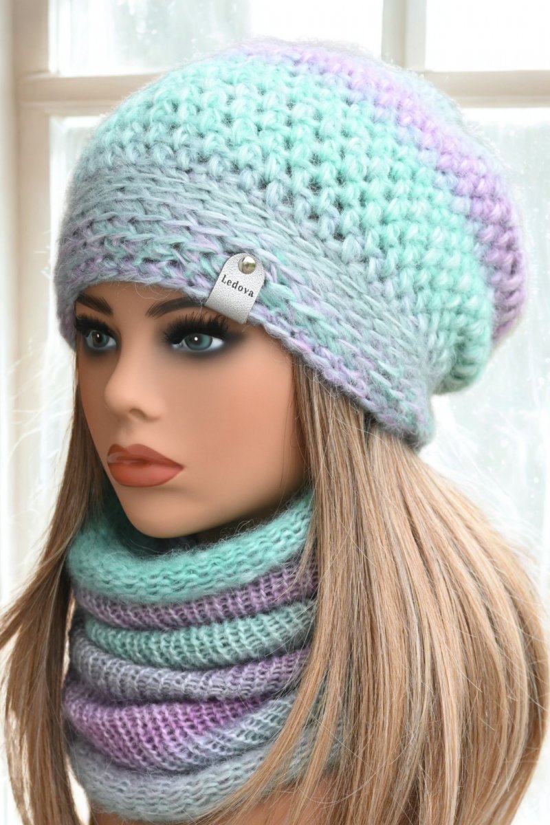 Háčkovaná a pletená souprava čepice s nákrčníkem z lehoučké nadýchané chlupatkové příze v krásných fialovo-mátových barvách.