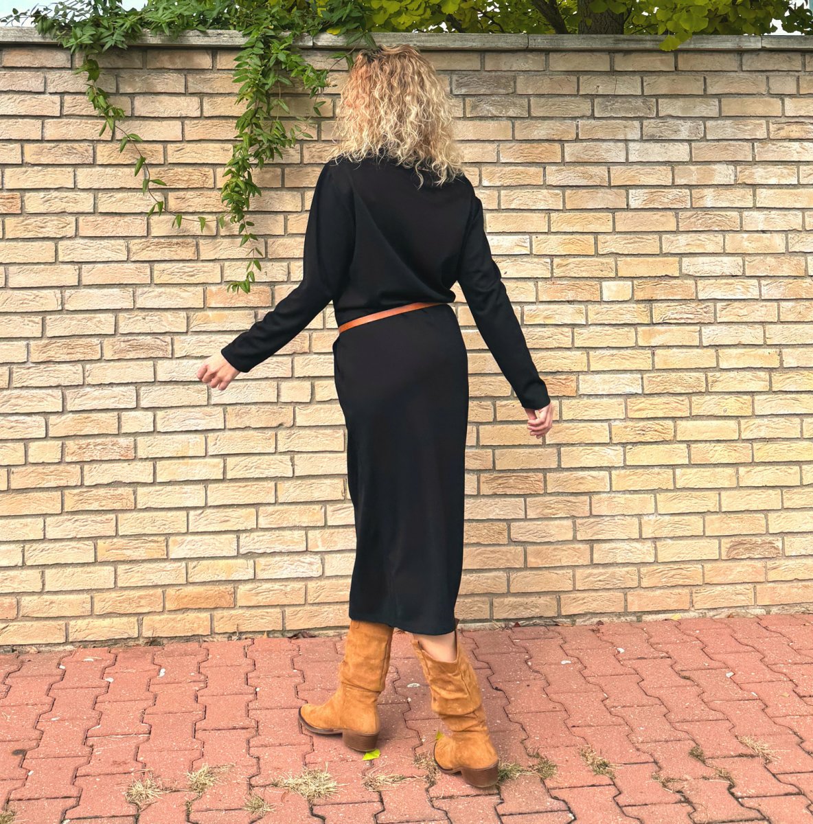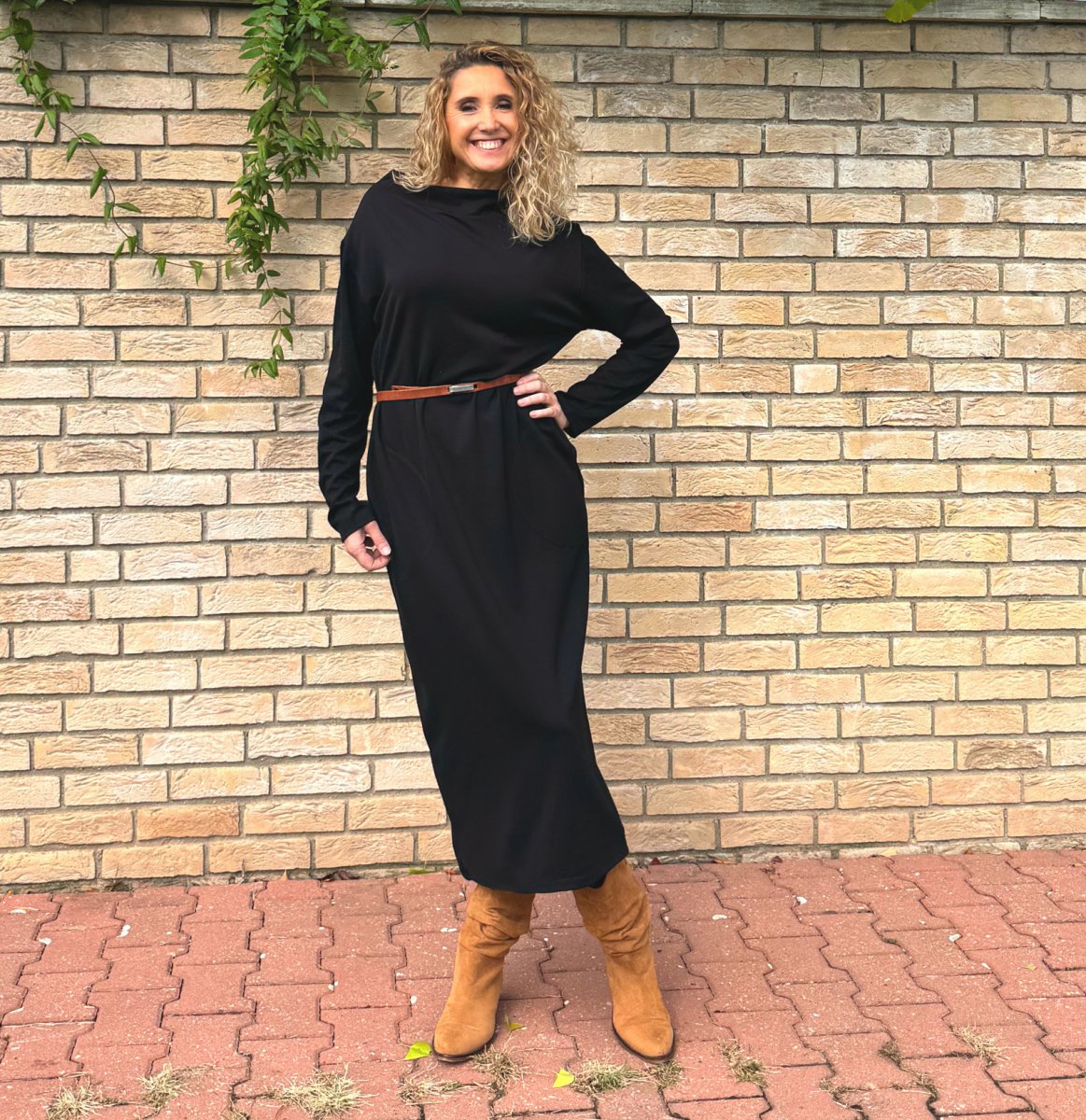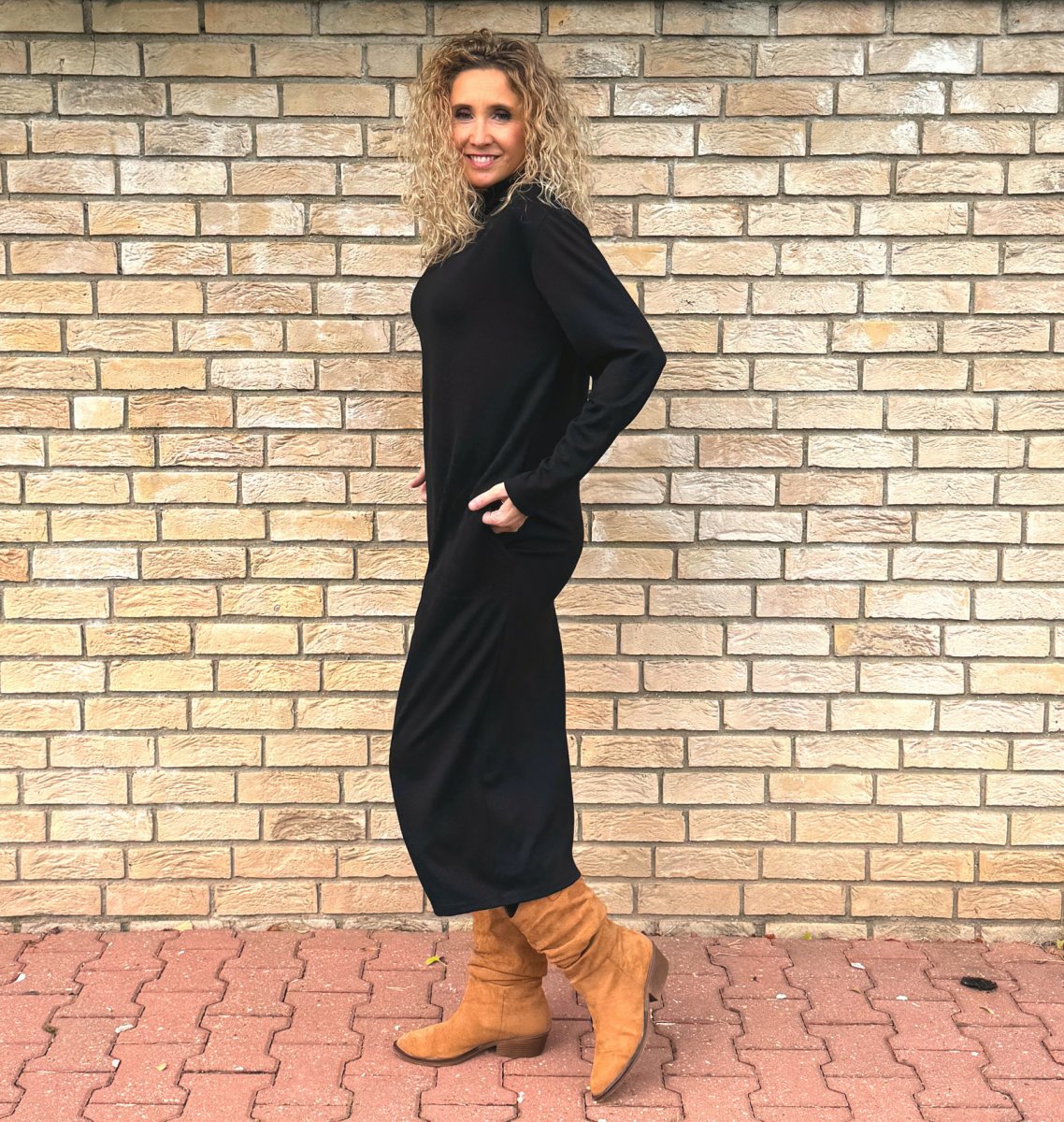 Univerzální pohodlné šaty z úpletu viskóza/polyester/elastan. Na bocích jsou kapsy. U krku je volný stojáček.