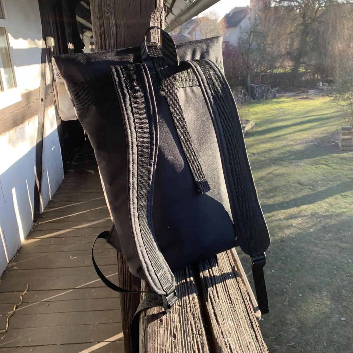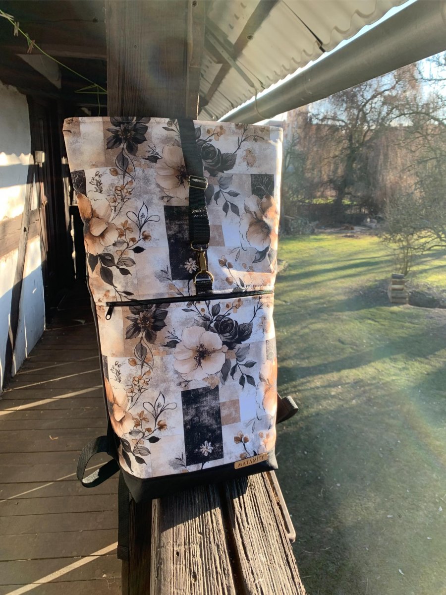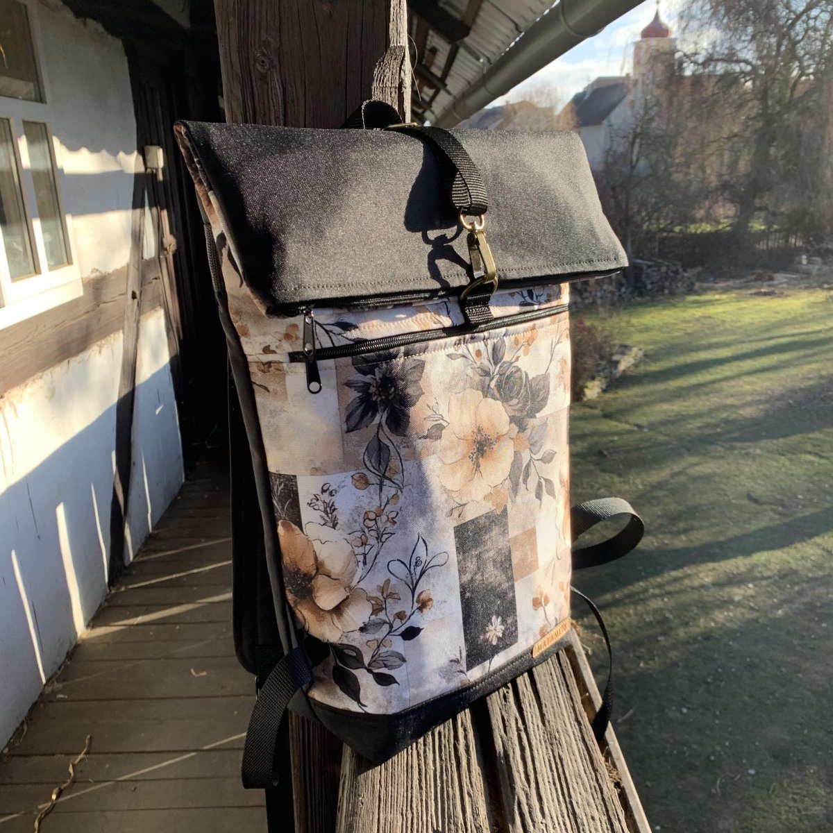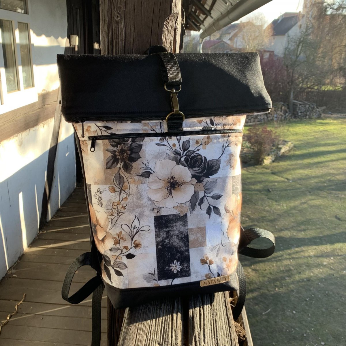 Batoh ušit z voděodolné kočárkoviny černé barvy a vzorované kočárkoviny. Na přední straně je kapsa na zip. Zapínání na zip a karabinu. Batoh ušit na průmyslovém čalounickém stroji, pevnou čalounickou nití.