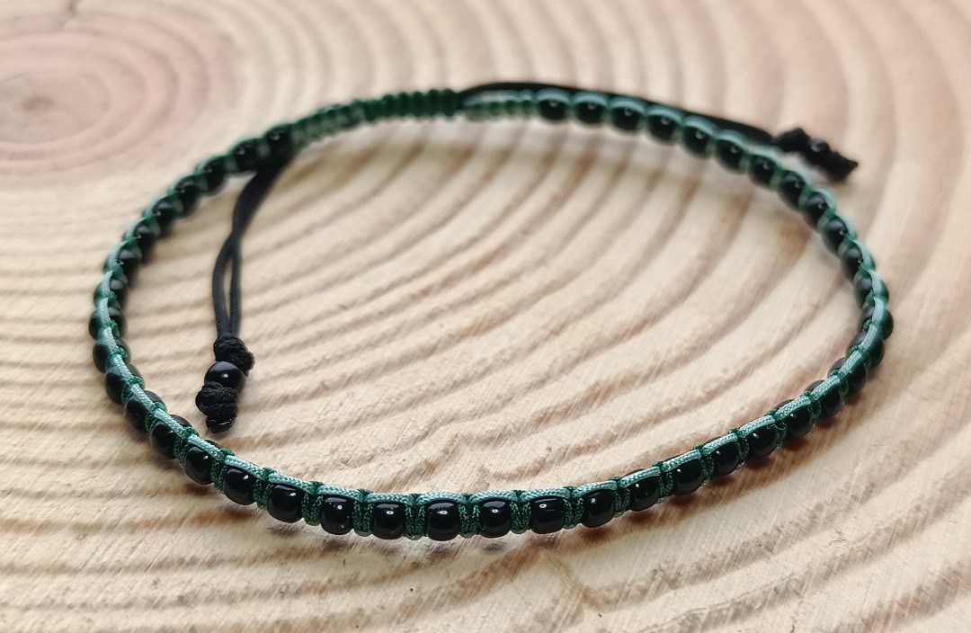 Náramek je vyroben z nylonové šňůry černé barvy. Dále světle a tmavě zelené tenké nylonové šňůry.