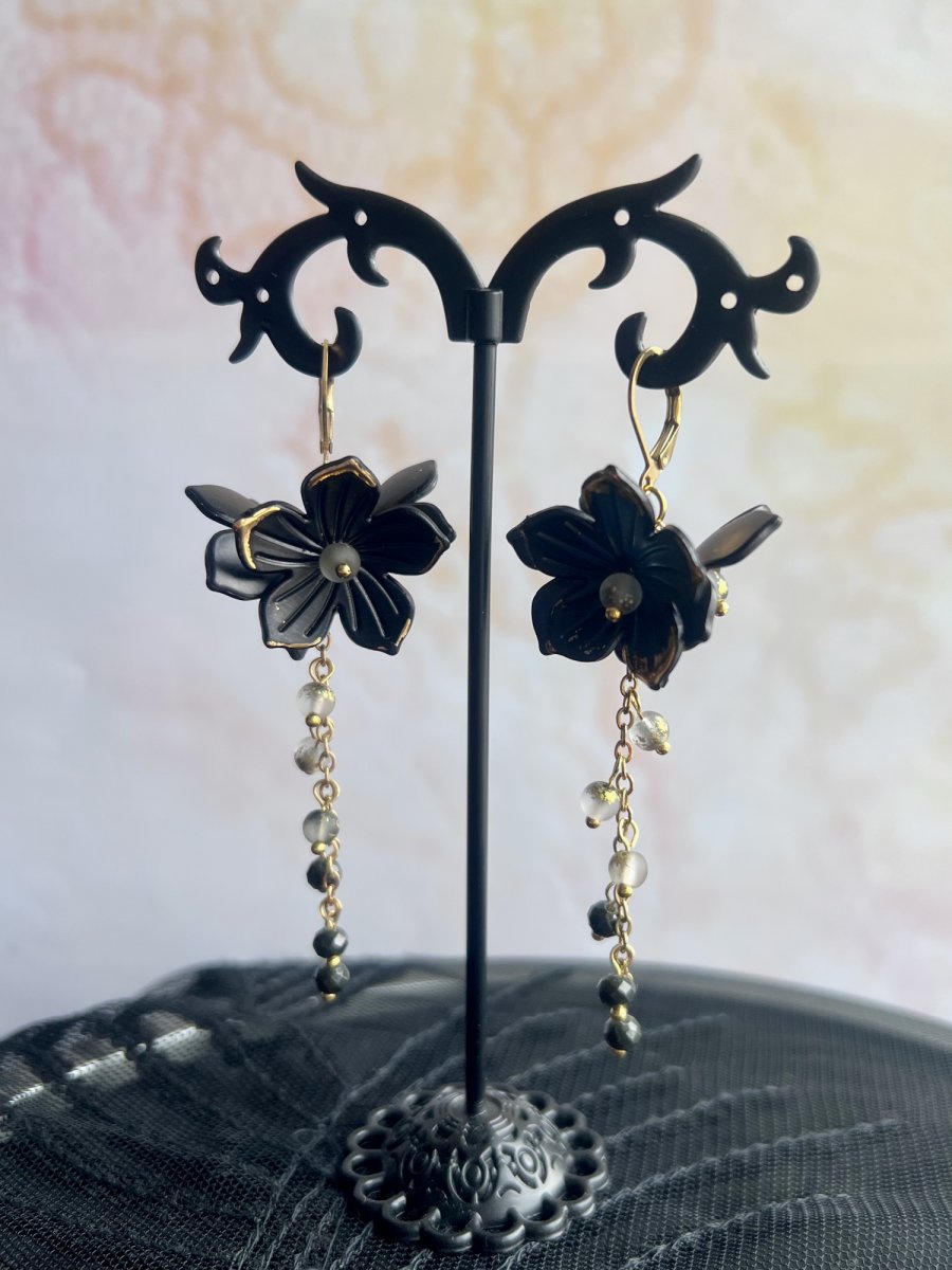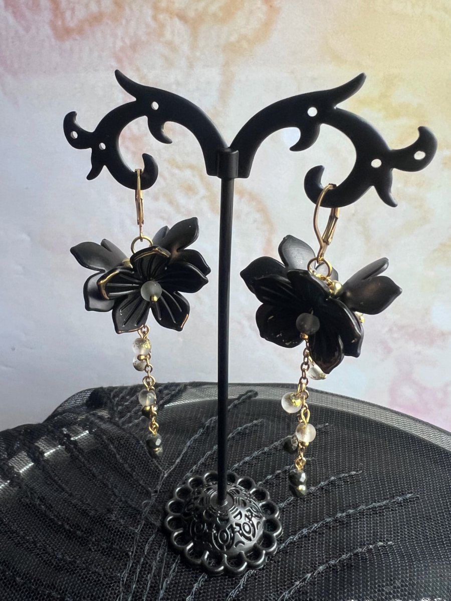 Dlouhé náušnice s plastovými květinkami a drobnými broušenými korálkami na pozlacených kroužkách a řetízku. Délka od háčku cca 6 cm, uzavíratelný háček z nerez oceli