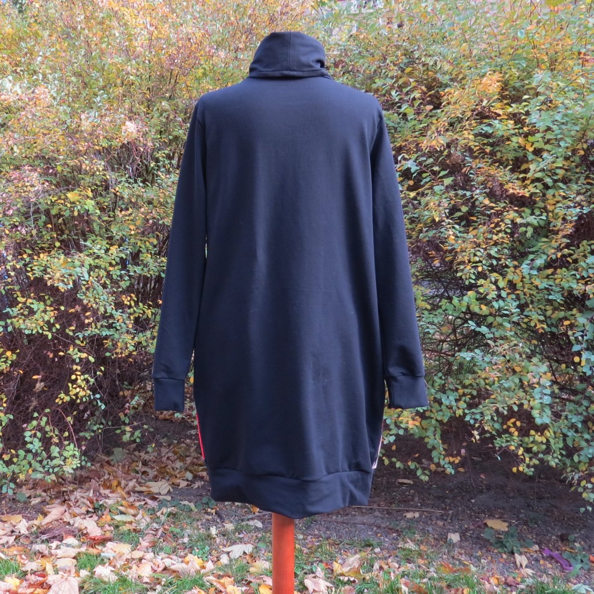 Rozměry: horní obvod = 102 cm, boky = 110 cm, délka rukávu včetně manžety 65 cm, délka šatů včetně manžety na spodním okraji 92 cm. Dobře padnou ženám, které nosí konfekční velikost 42.