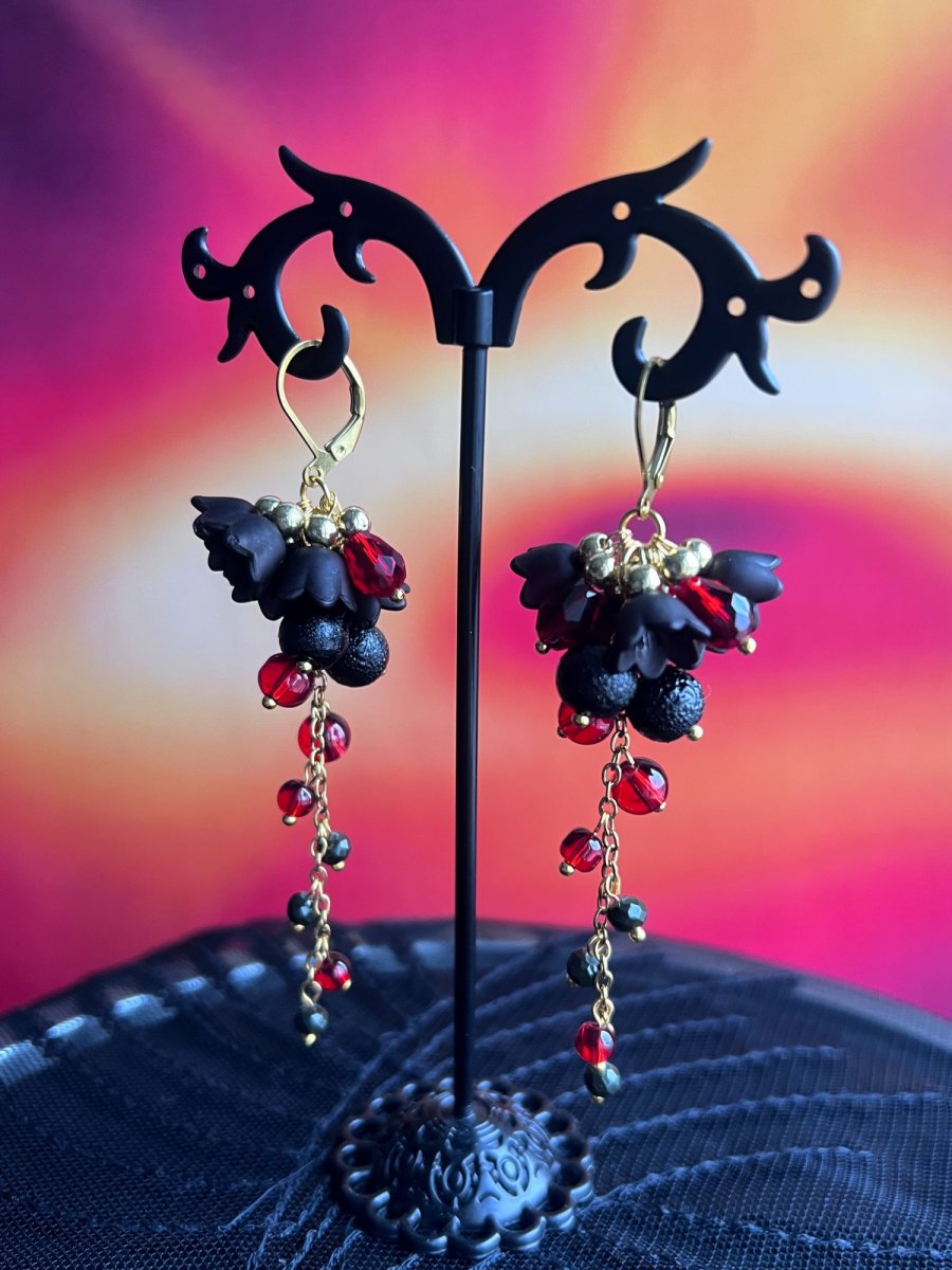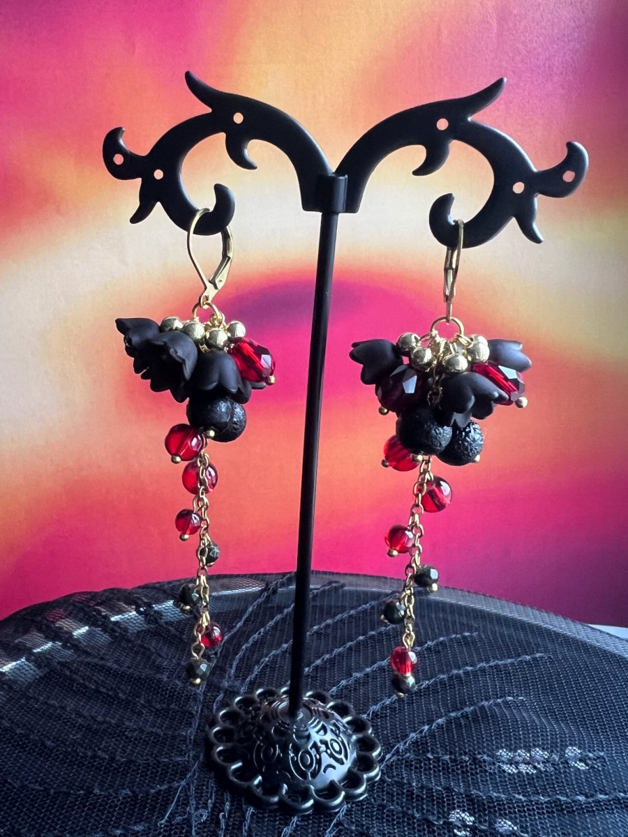 Dlouhé náušnice s drobnými broušenými korálkami (6 a 4 mm) a plastovými zvonečky na pozlacených kroužkách a řetízku. Délka od háčku cca 7 cm, uzavíratelný háček z nerez oceli