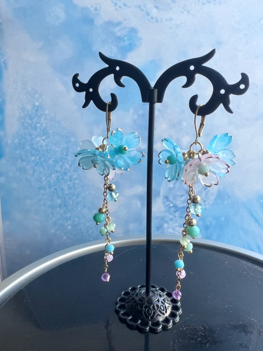 Dlouhé náušnice s plastovými květinkami a drobnými broušenými korálkami na pozlacených kroužkách a řetízku. Délka od háčku cca 7 cm, uzavíratelný háček z nerez oceli
