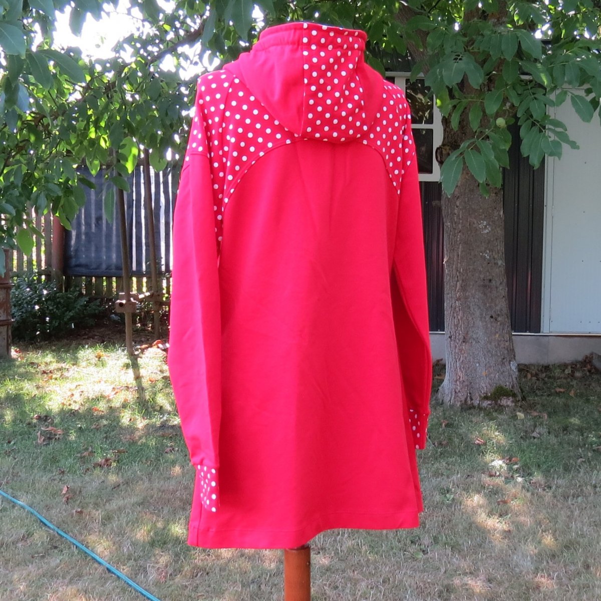 Mikinošaty pro volný čas, pohodu, do přírody i do města. Jsou ušité z červené teplákoviny, sedlo, horní část rukávů, manžety a střední díl kapuce jsou z červené teplákoviny s bílými puntíky. Vnitřek kapuce je bílý. Mají rozšířený střih do A a raglánové rukávy.. Mají velkou kapucu se stahováním tkaničkou z červené teplákoviny s puntíky. V bočních švech jsou kapsy.