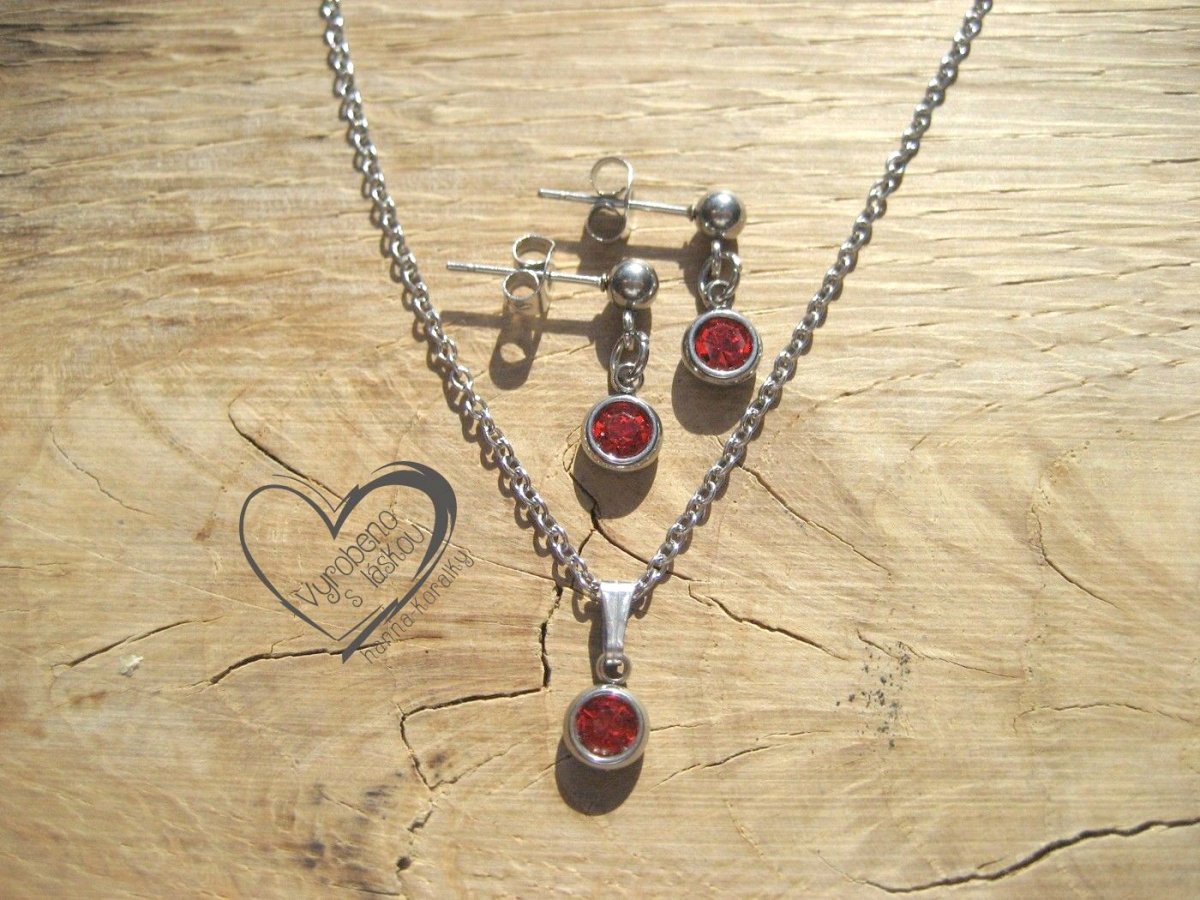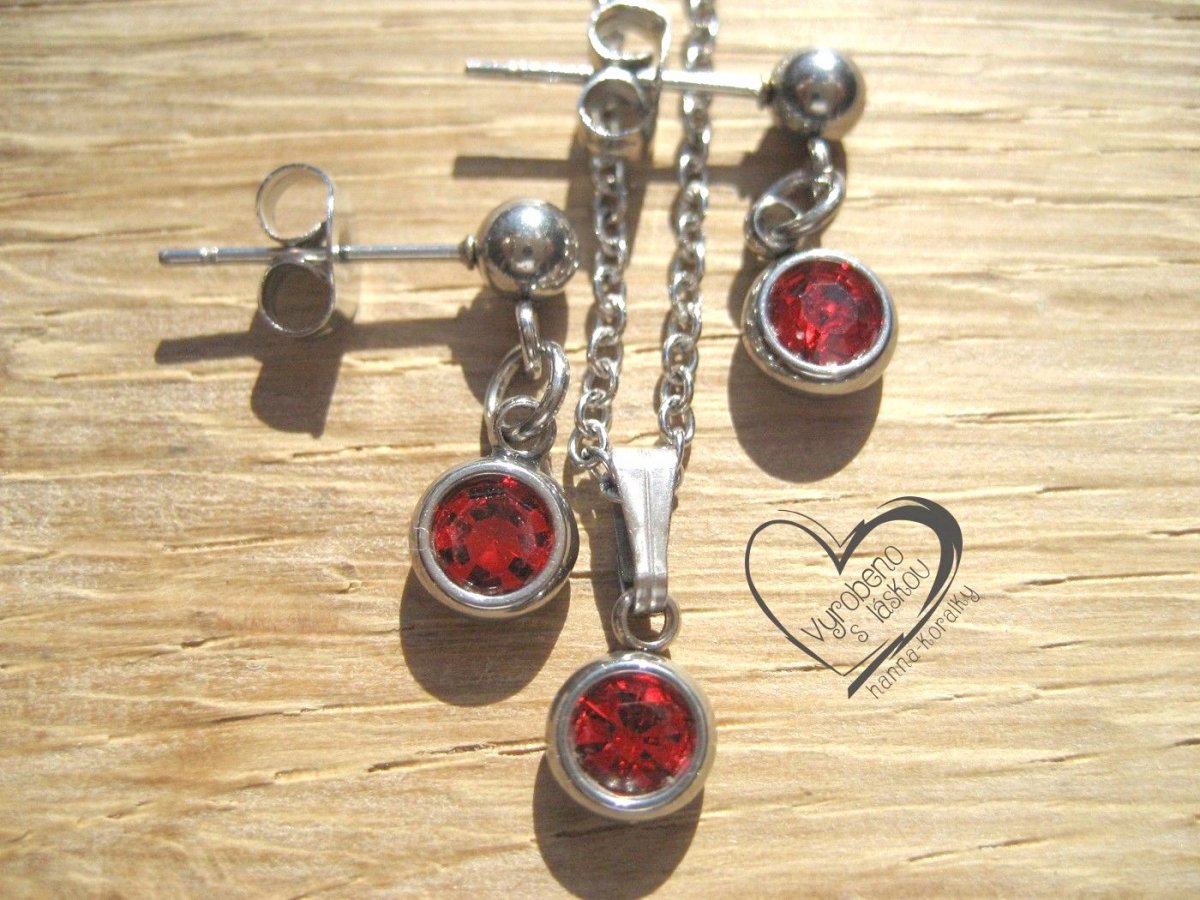 Jemná, jednoduchá a přitom elegantní sada řetízku a náušnic z nerez oceli s červeným skleněným korálkem, délka řetízku 45 cm, průmer přívěsku 5 mm