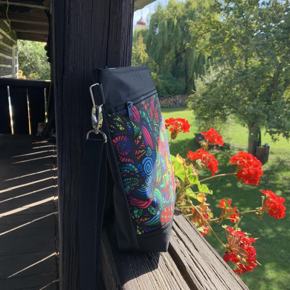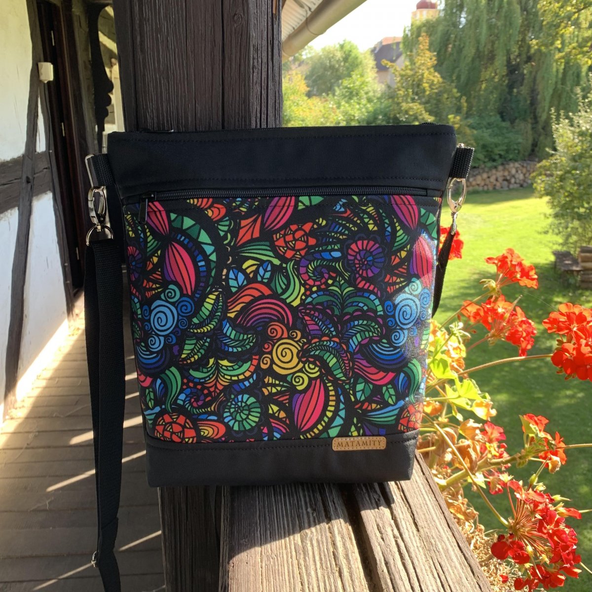 Crossby kabelka ušita z batohoviny černé a vzorované kočárkoviny, která je voděodolná.
