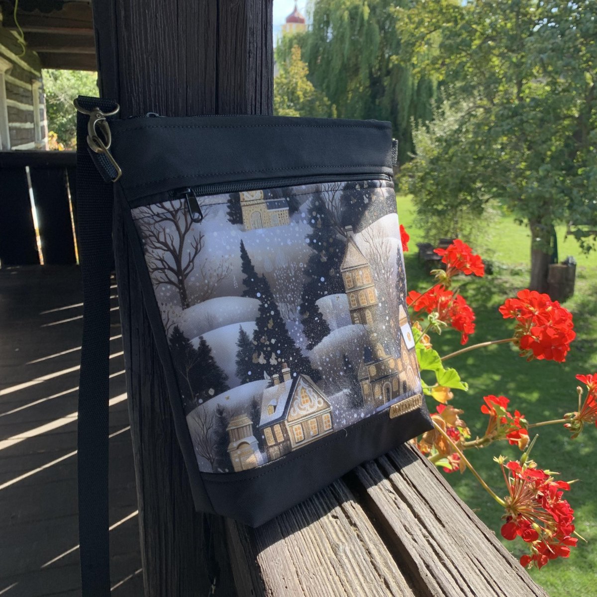 Crossby kabelka ušita z batohoviny černé a vzorované kočárkoviny, která je voděodolná.
