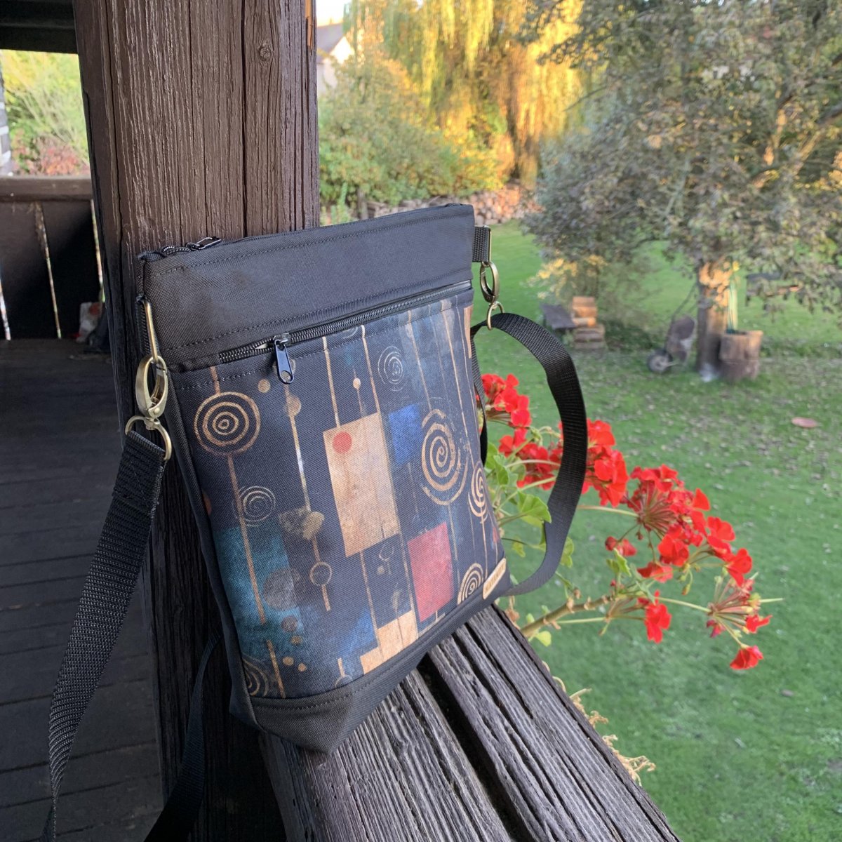 Crossby kabelka ušita z batohoviny černé a vzorované kočárkoviny, která je voděodolná.