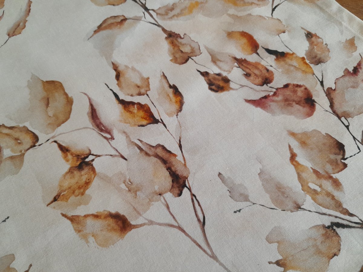 Nabízím středový čtvercový ubrus šitý z béžové látky s listy v hnědých tónech.