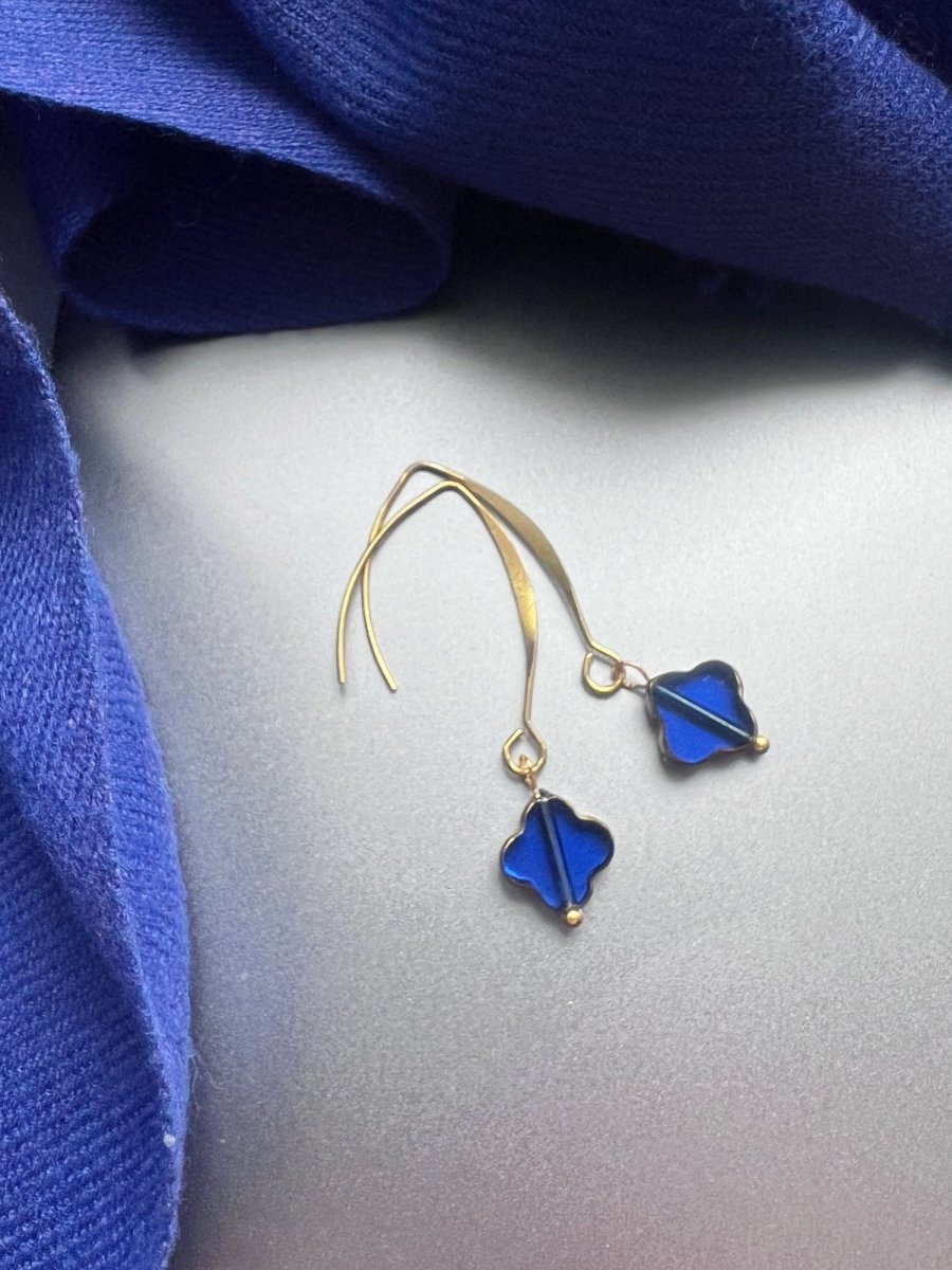 Náušnice s drobným skleněným přívěskem čtyřlístku cca 1 cm, dlouhý háček cca 2,8 cm, komponenty z pozlacené nerez oceli - vhodné pro alergiky.