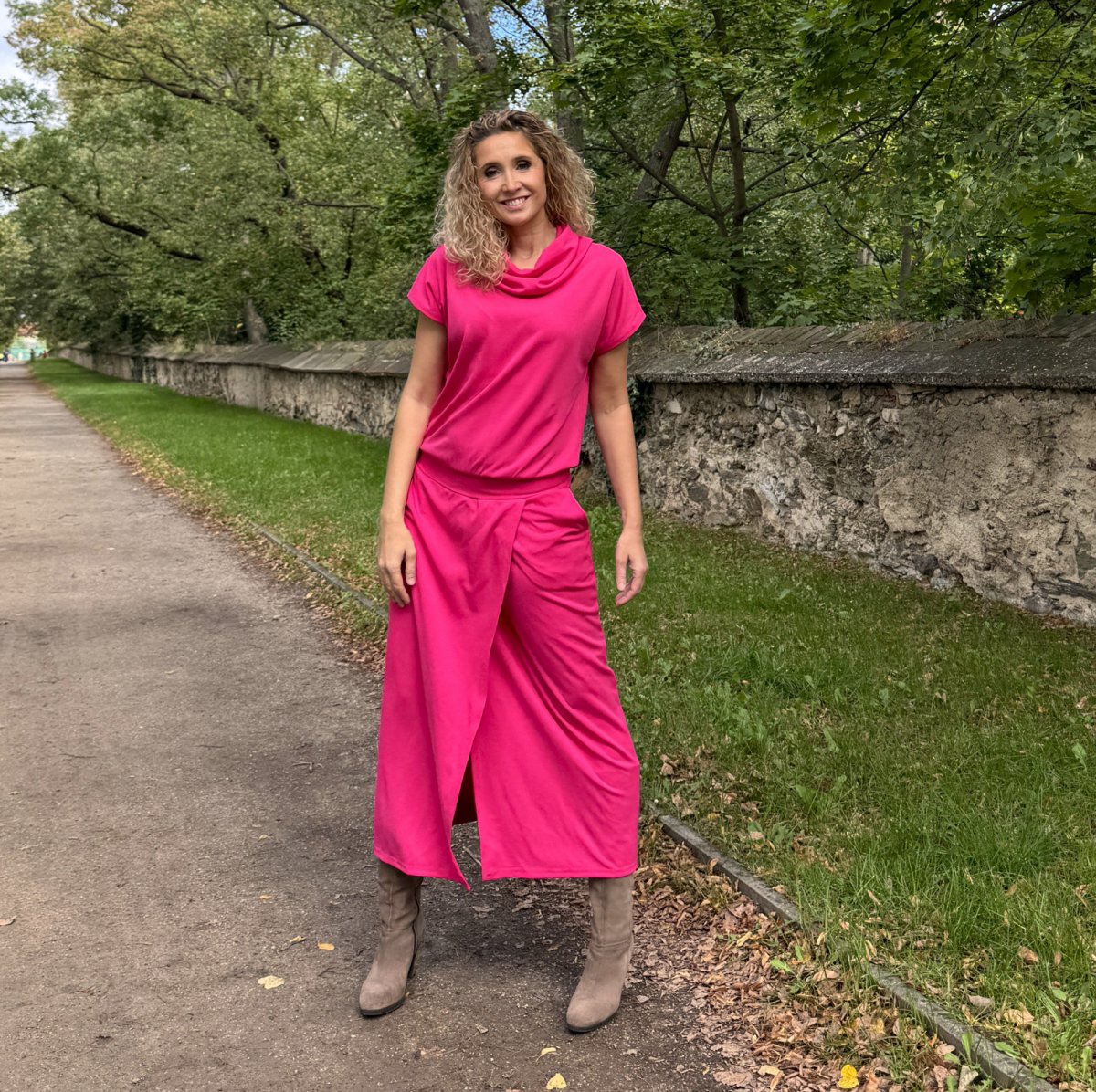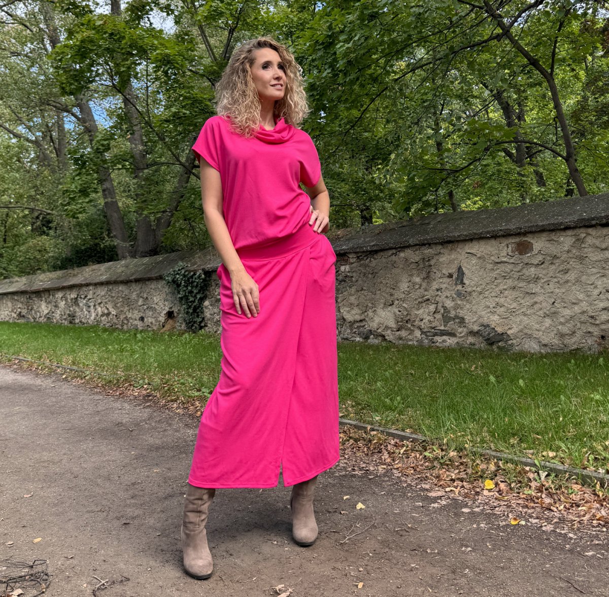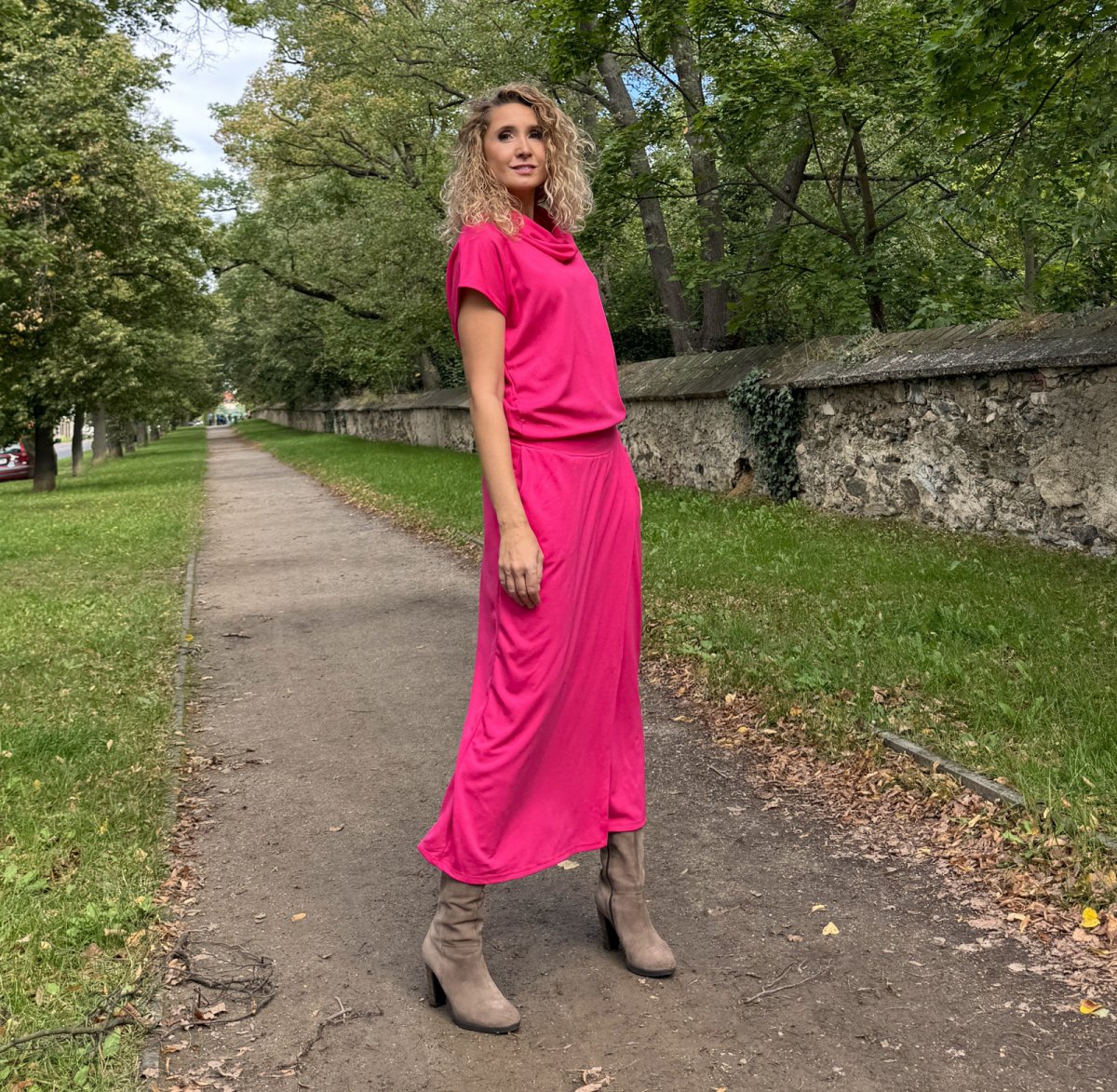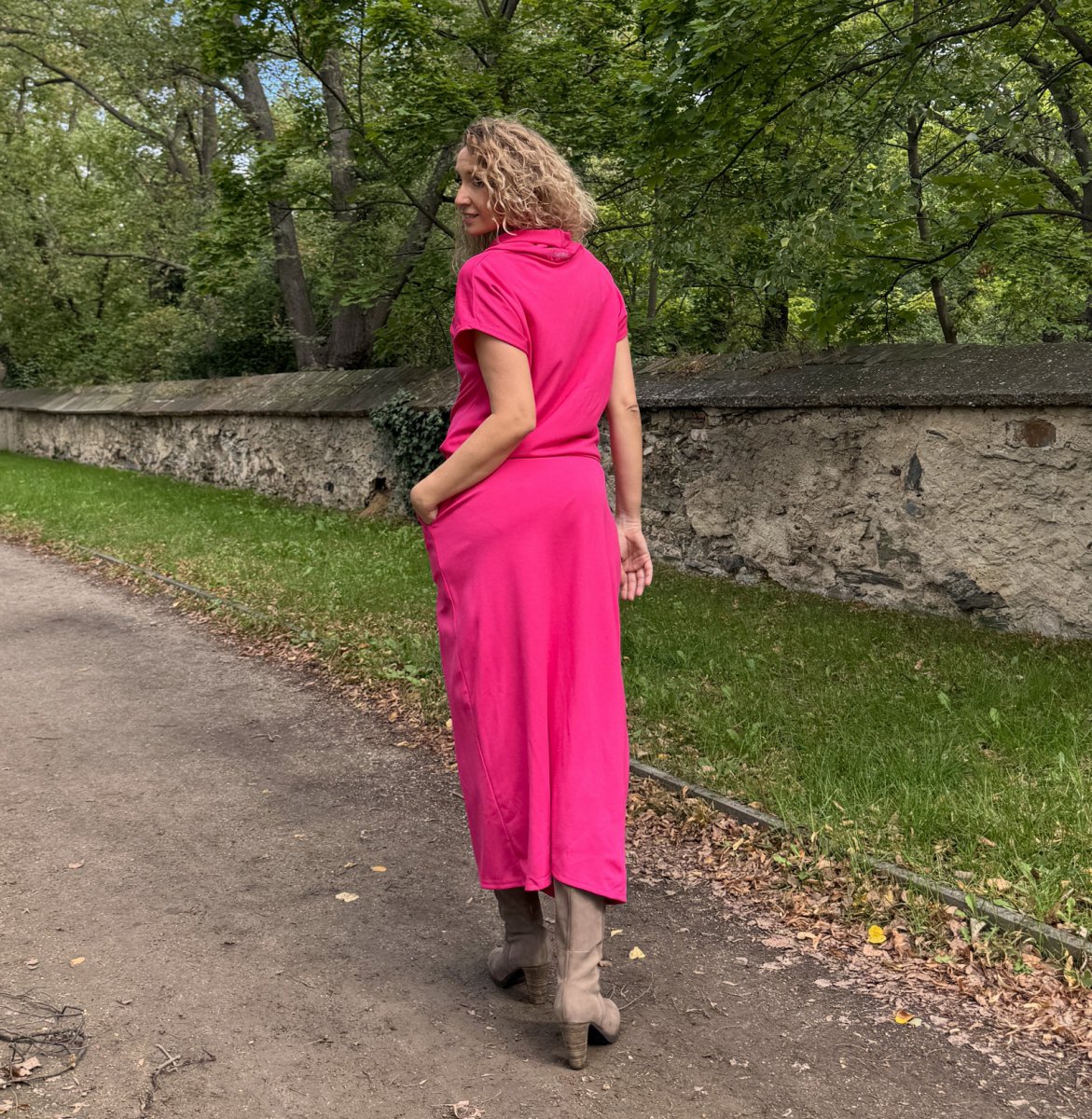 Cyklámen šaty dlouhé s rozparkem