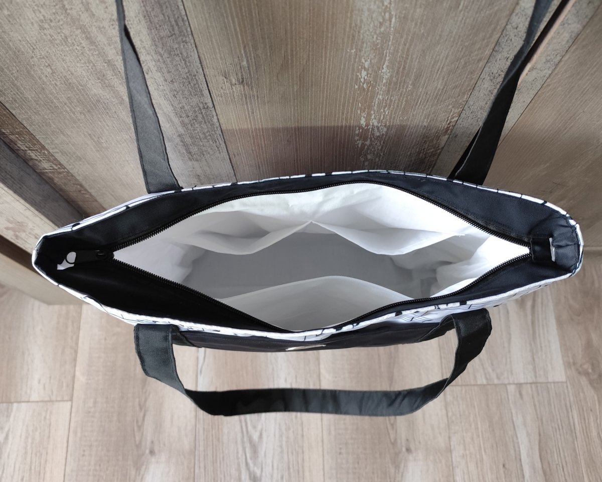 Kabela je vystužená a vypodšívkovaná. Uvnitř je z jedné strany uzavíratelná kapsa na zip šíře 20 cm a hloubky 17 cm. z druhé strany uvnitř je volná půlená kapsa šíře 25 cm ( dvě kapsy o šířce 12,5 vhodné například na klíče,mobil, nebo brýle a hloubky 16 cm.