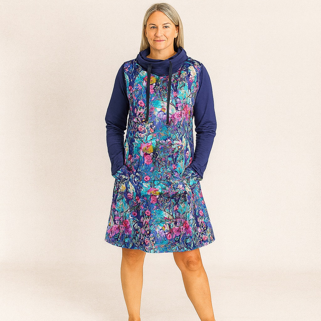 Hledáte kousek, který v sobě spojuje maximální pohodlí a nepřehlédnutelný design? Naše šatotunika s barevný vzorem vzorem a kontrastními tmavě modrými rukávy je přesně to, co váš šatník potřebuje. Díky promyšlenému střihu a kvalitnímu materiálu se v ní budete cítit skvěle v práci, ve městě i na procházce.