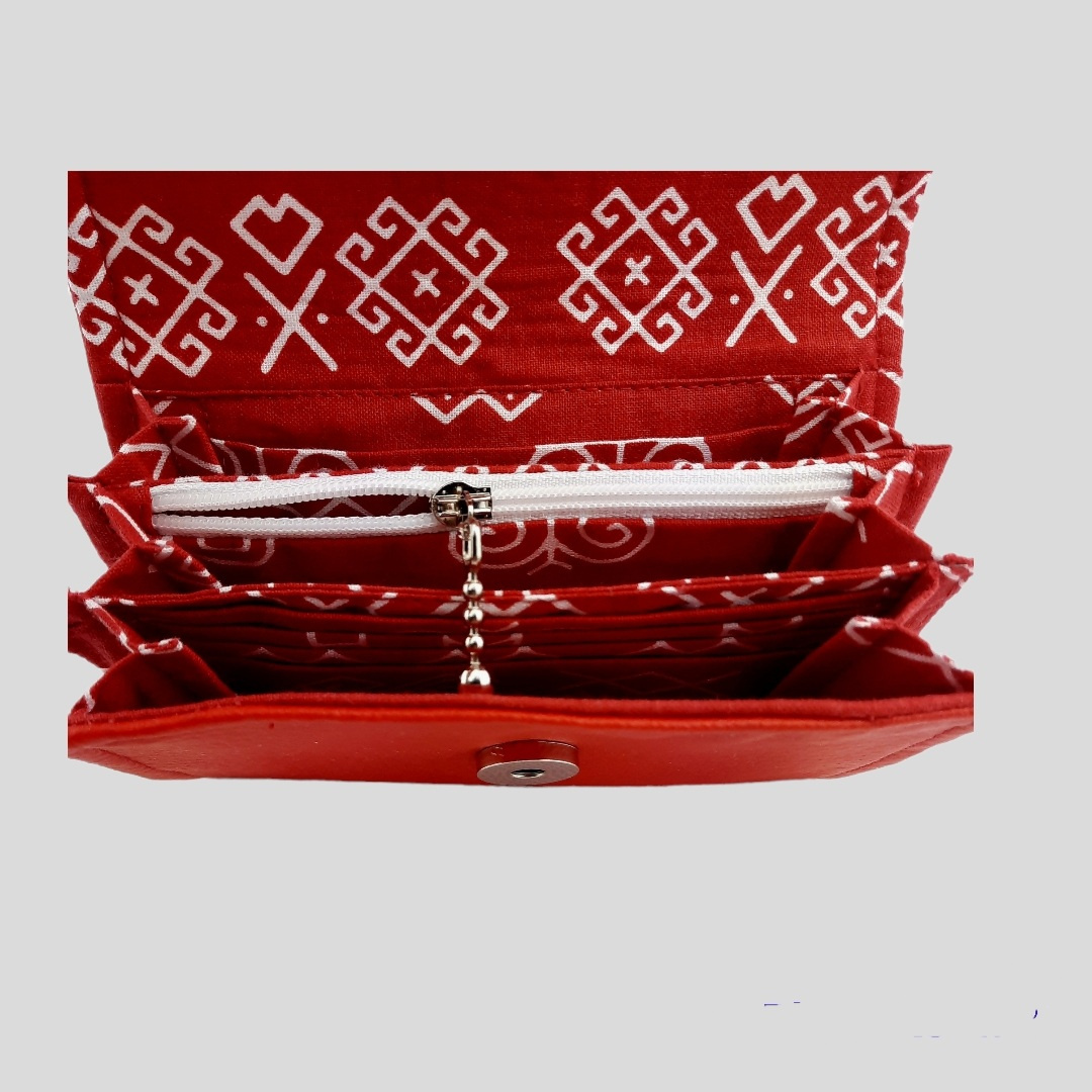Peňaženka je vyrobená z umelej kože, zapína sa na magnetku, má 8 priehradok na kreditné karty a iné doklady, 1 zazipsovateľnú kapsičku na mince a 2 priehradky na bankovky. Rohy peňaženky sú spevnené a ozdobené kovovými prvkami. Peňaženka je zdobená výšivkou vo folklórnom tóne. Celá peňaženka je starostlivo vystužená, aby bola pevná a dlho slúžila svojmu účelu.