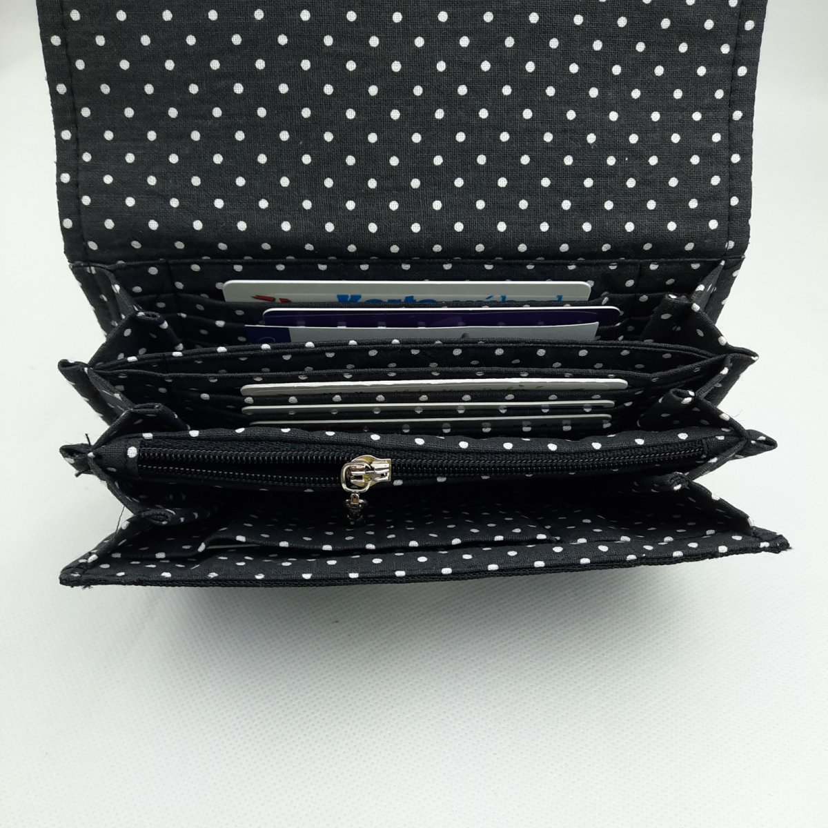 Peňaženka je vyrobená z vodeodolného, umývateľného materiálu, zapína sa na magnetku, má 8 priehradiek na kreditné karty a iné doklady, 1 zazipsovateľnú kapsičku na mince a 2 priehradky na bankovky. Peňaženka má aj jednu skrytú priehradku na bankovky, ktorú oceníte hlavne pri platení v radoch pri pokladni. Jej hlavnou úlohou je skryť peniažky pred zvedavými zrakmi ľudí okolo Vás. Rohy peňaženky sú spevnené a ozdobené kovovými prvkami. Celá peňaženka je starostlivo vystužená, aby bola pevná a dlho slúžila svojmu účelu.