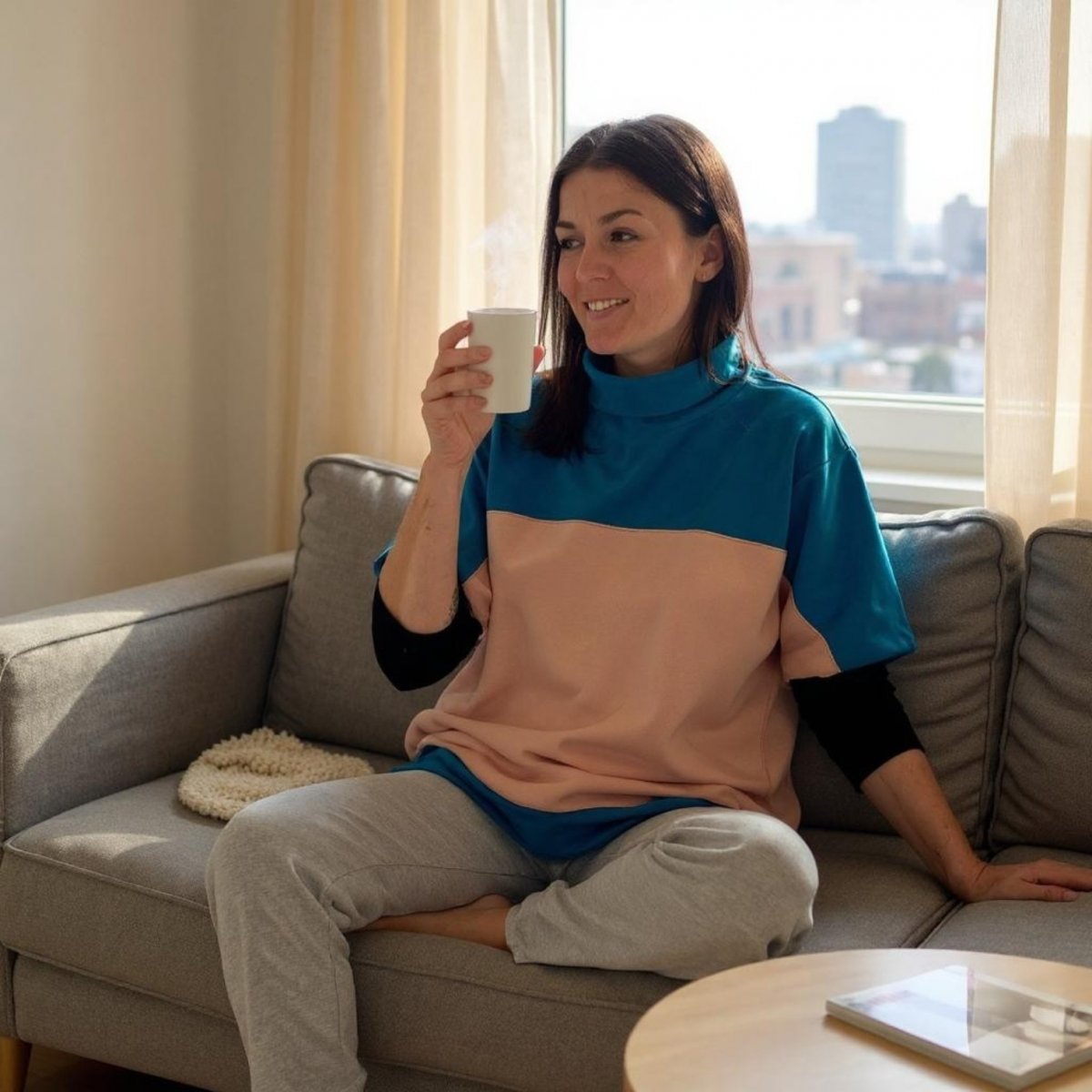 Modelka má na sobě M/L, nosí velikost M, výška 169 cm, váha 63kg a přes hruď 96cm.