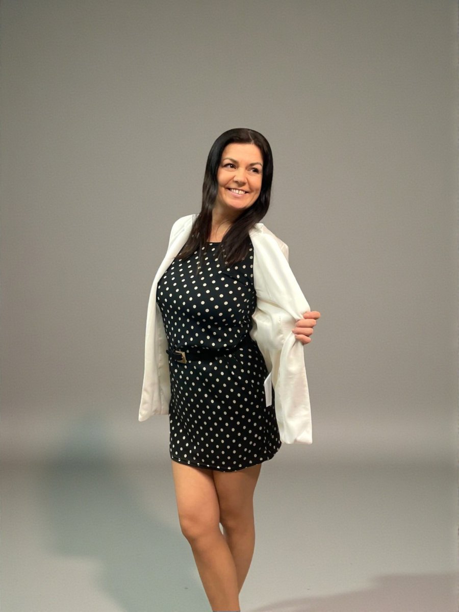 Hravý design: Klasický puntíkovaný vzor dodává šatům veselý a mladistvý vzhled, který se hodí pro různé příležitosti, od kávy s kamarádkou po neformální večerní akci.