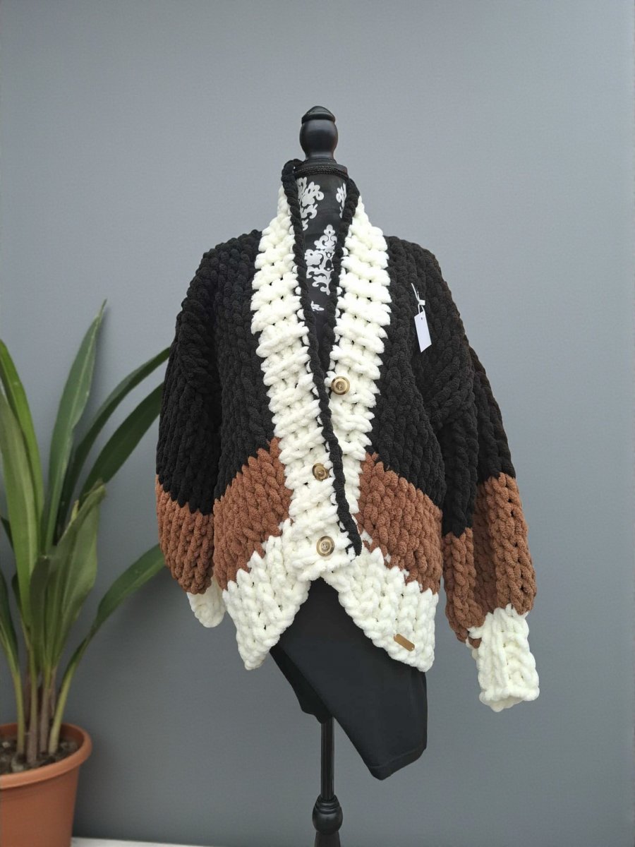 Praktické zapínání dodává svetru funkčnost a styl, velikost M/L padne pohodlně většině postav. Každý kousek je originál, pletený s láskou a péčí.