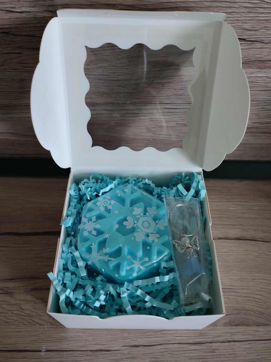 Malá dárková krabička, která obsahuje mýdlo ve tvaru vločky a klíčenku andílka.