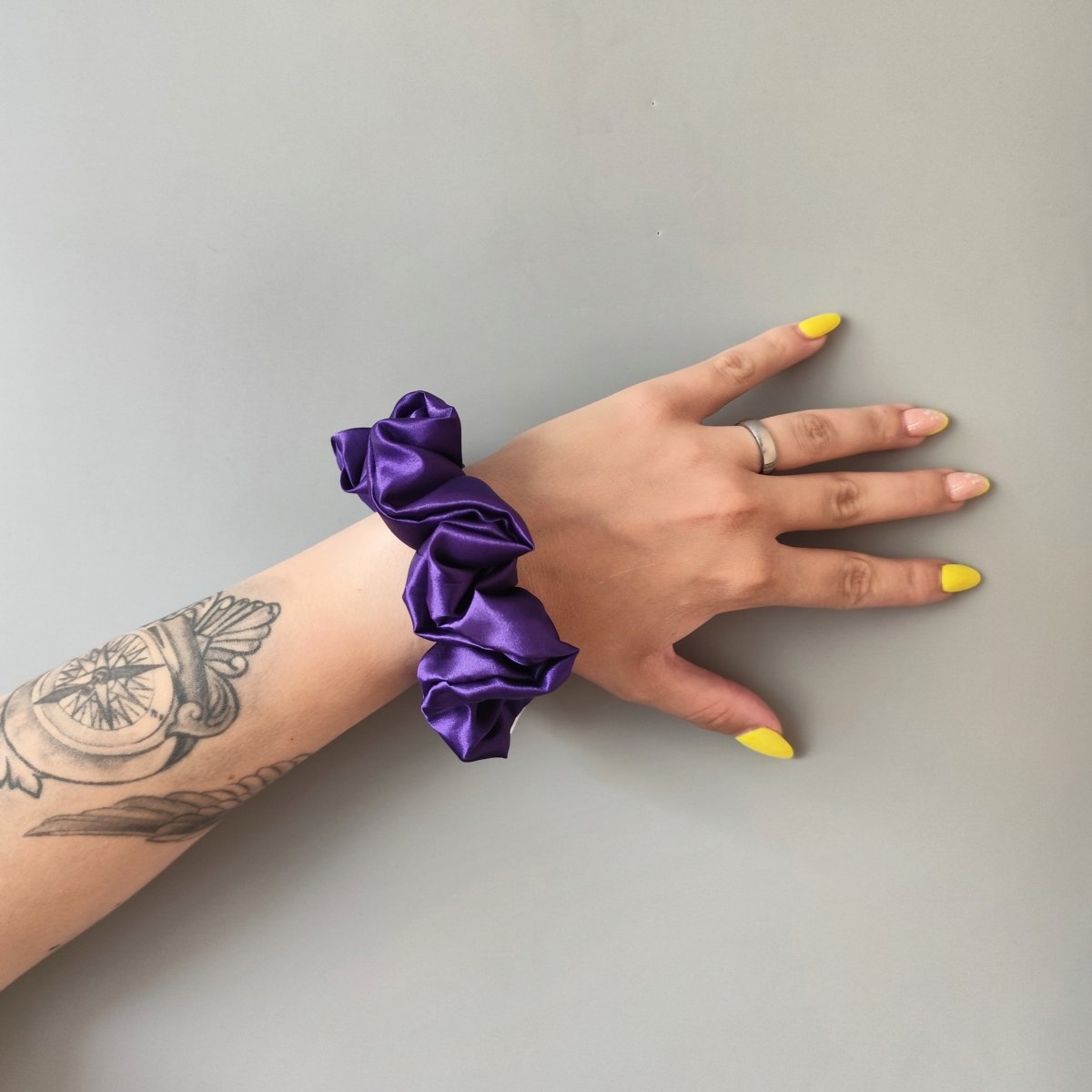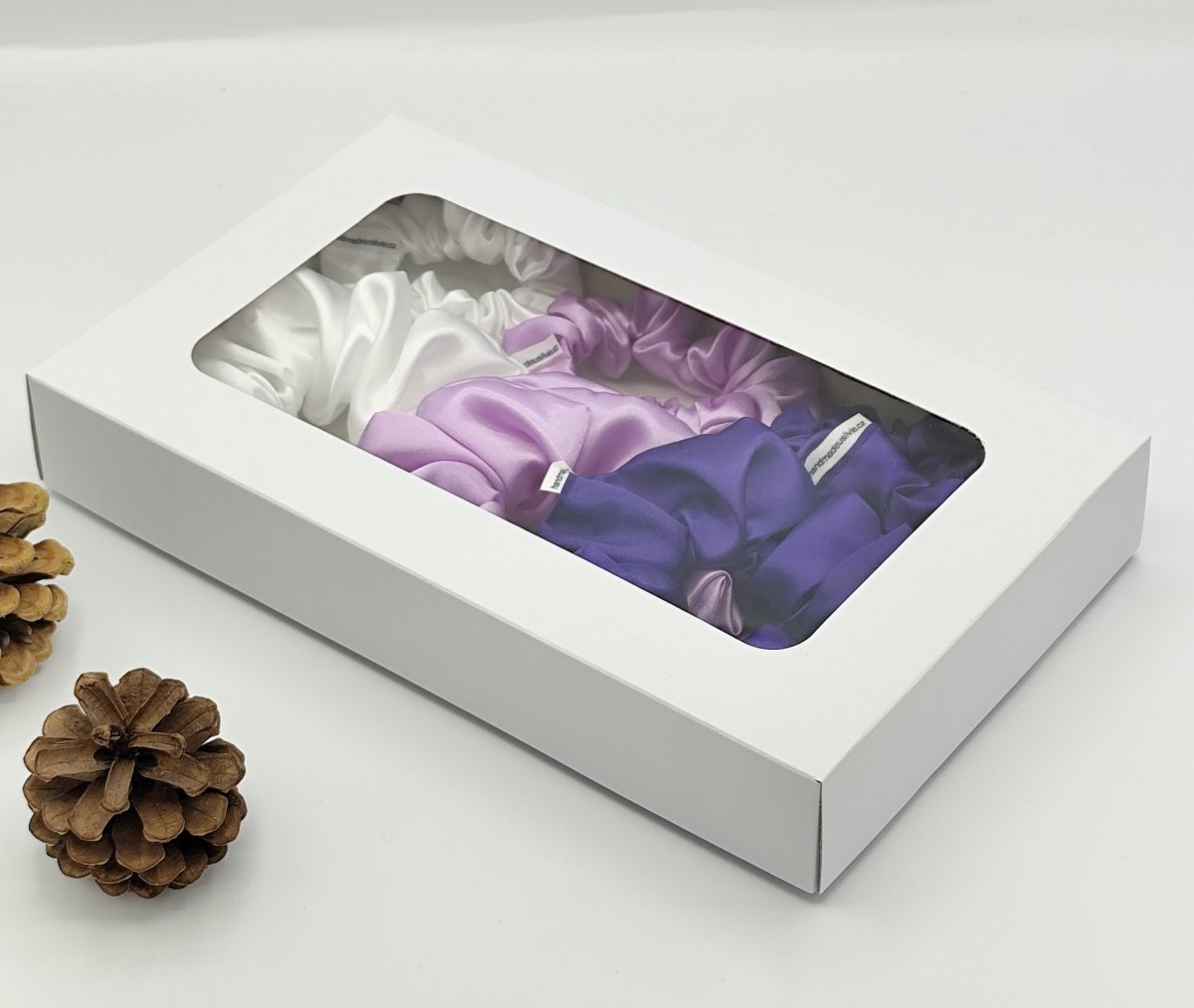 Dárková sada saténových scrunchies gumiček je nakombinovaná ve fialových barvách.
