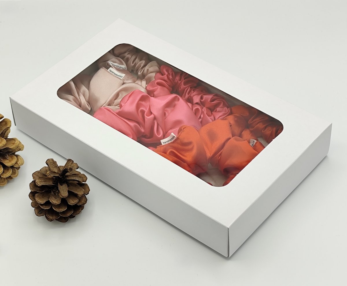 Dárková sada saténových scrunchies gumiček v pudrově růžové, pink a červené barvě.