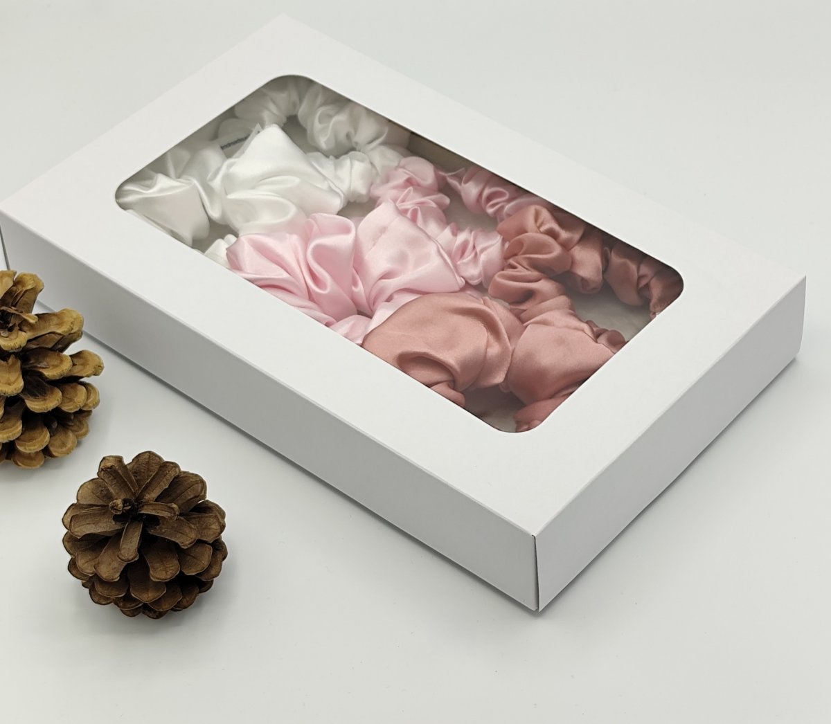 Dárková sada saténových scrunchies gumiček je nakombinovaná v růžových barvách.