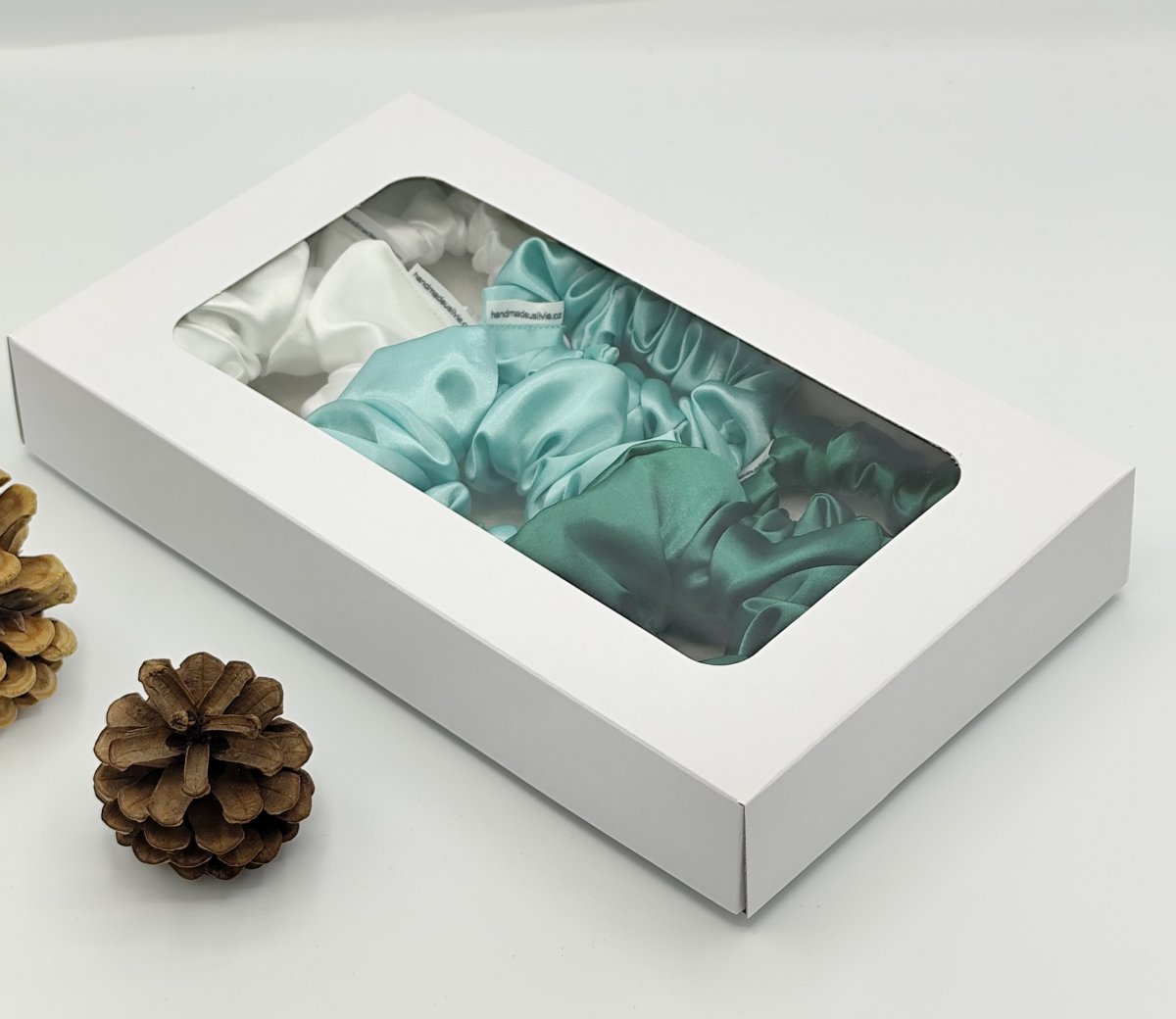 Dárková sada saténových scrunchies gumiček je nakombinovaná v zelených odstínech.