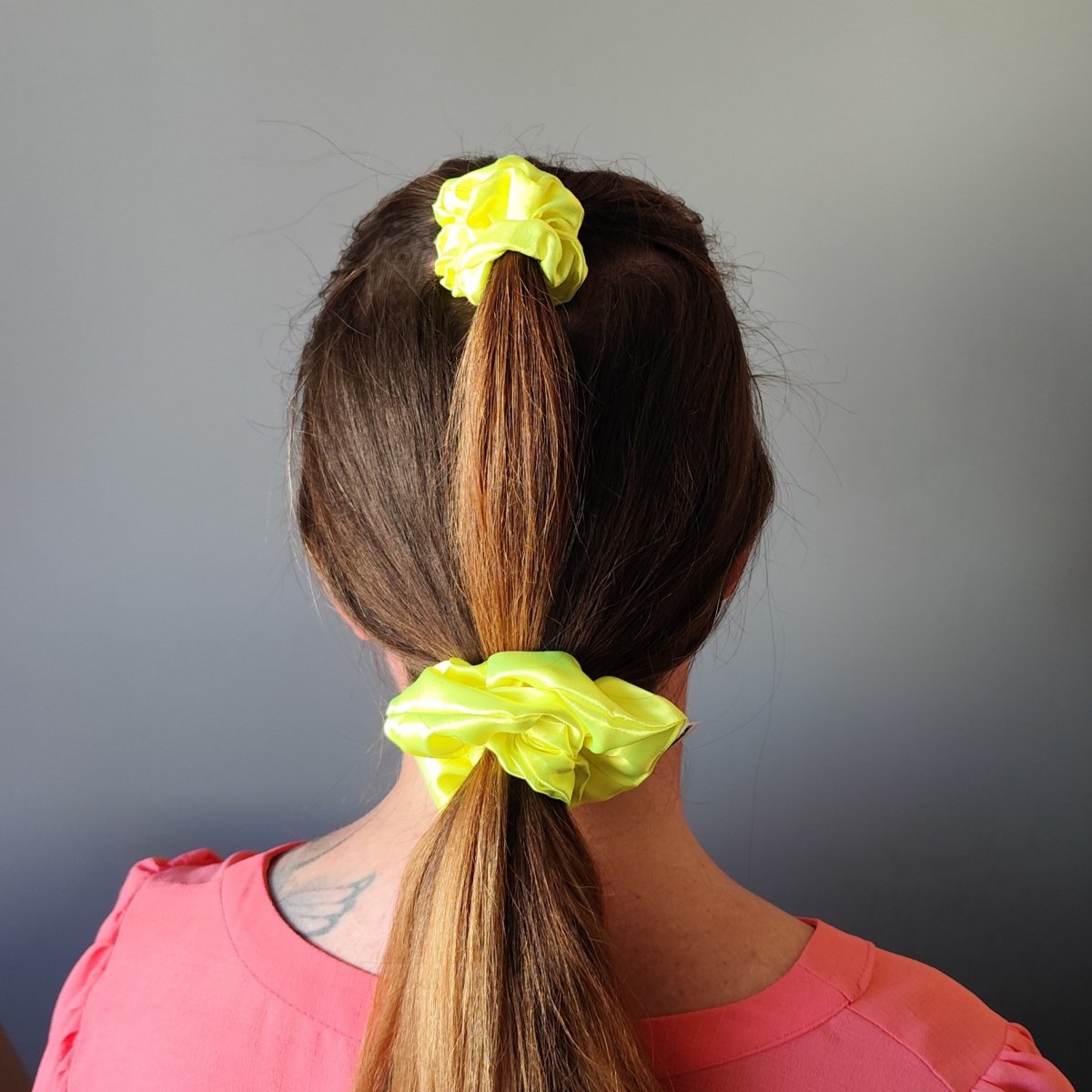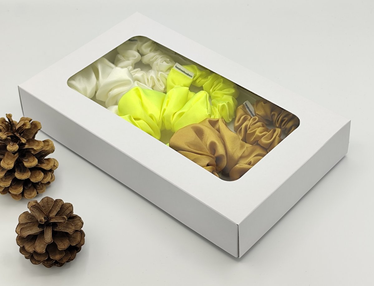 Dárková sada saténových scrunchies gumiček je nakombinovaná ve žlutých barvách.