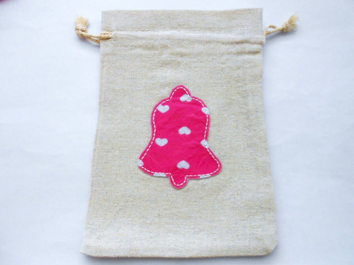 Lněný pytlík s ručně dělanou a přišitou aplikací zvonku - 7x6 cm, je pevný. Snadno ho uzavřete pomocí dvou bavlněných stahovacích šňůrek.