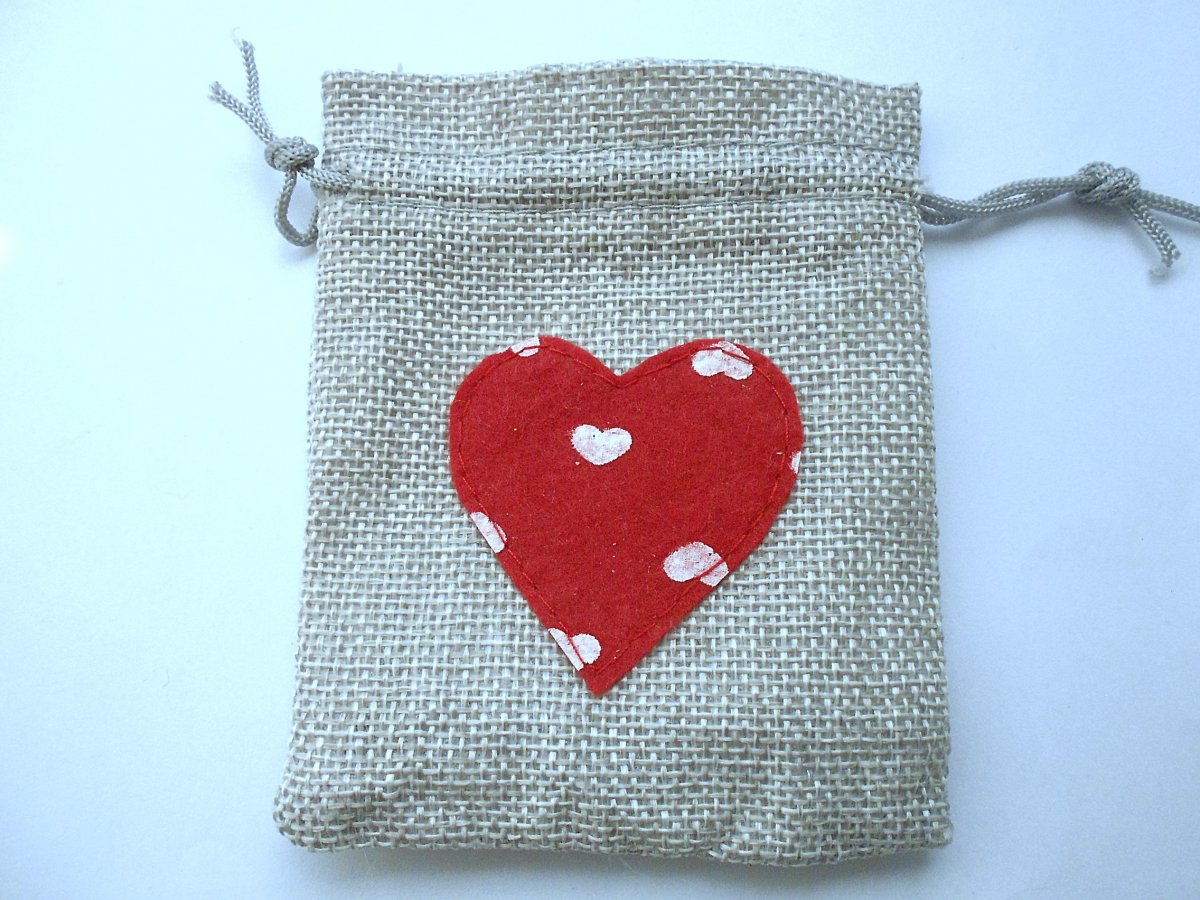 Dárkový pytlík připomíná svým materiálem přírodní jutu. Uvnitř je podšitý netkanou textilií. Snadno se uzavírá pomocí dvou stahovacích polyesterových šňůrek, šedý, ozdobený ručně vyrobeným a našitým srdíčkem.
