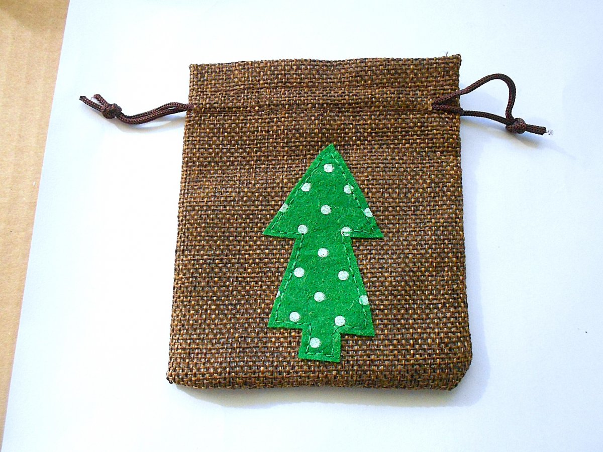 Dárkový pytlík připomíná svým materiálem přírodní jutu. Uvnitř je podšitý netkanou textilií. Snadno se uzavírá pomocí dvou stahovacích polyesterových šňůrek, hnědý, ozdobený ručně vyrobeným a našitým stromečkem.