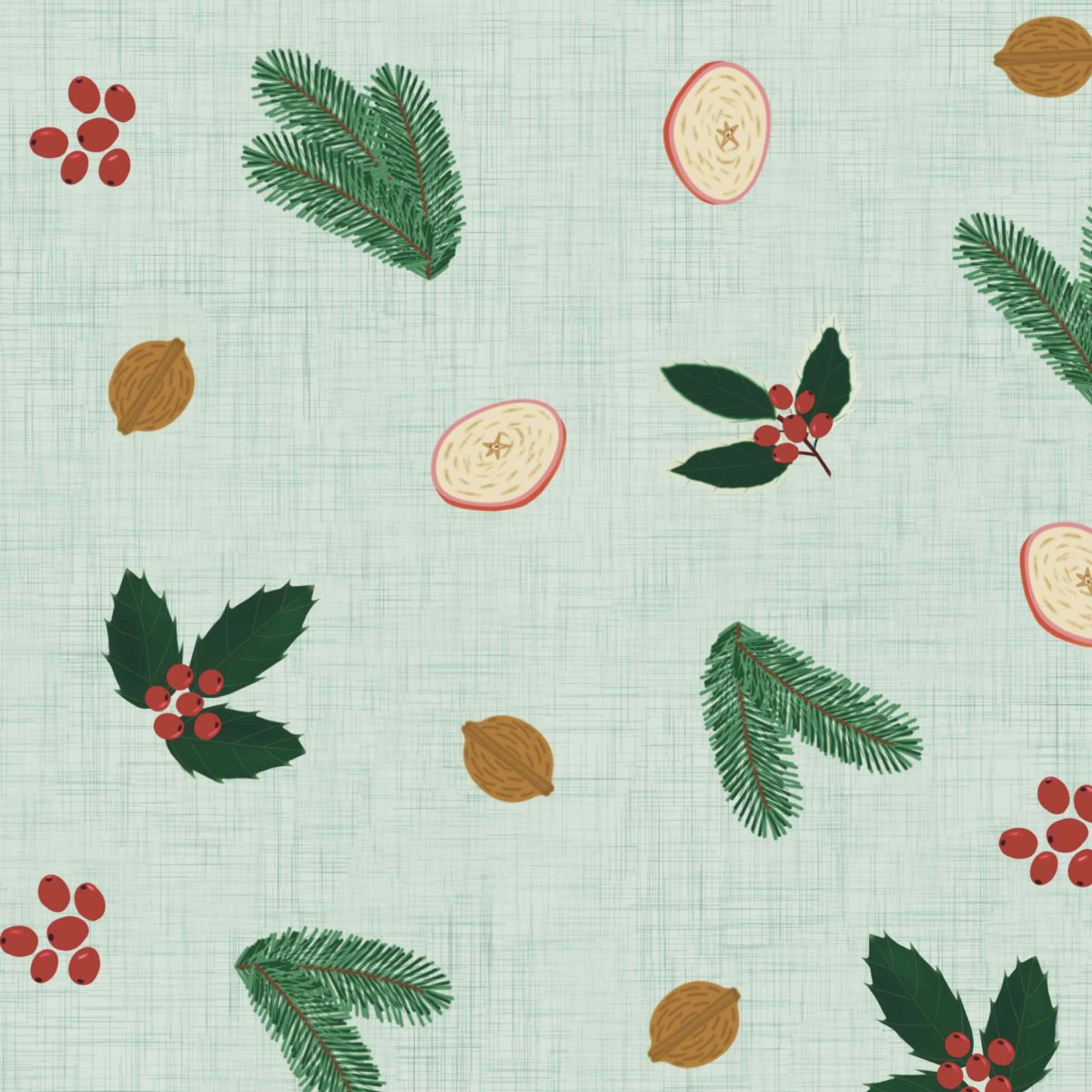 Darovací papírová ručně skládaná obálka s autorskou grafikou s vánočními větvičkami, řečný a křížalami na světle zeleném pozadí - velký vzor.