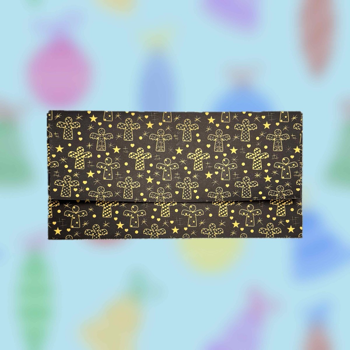 Darovací papírová ručně skládaná obálka s autorskou grafikou se zlatými andělíčky mezi hvězdami na antracitovém pozadí.