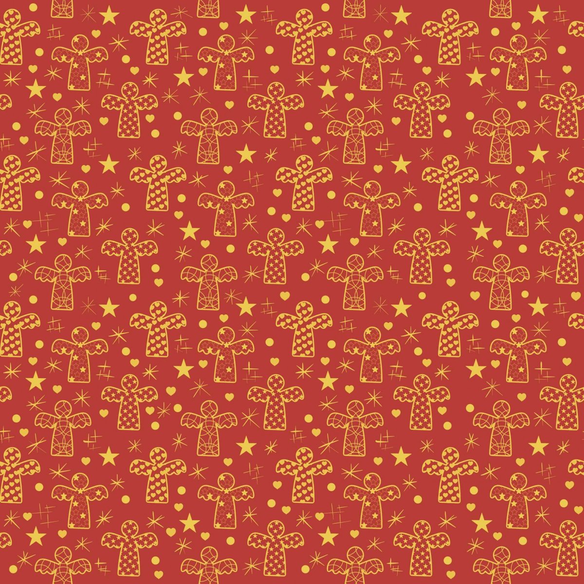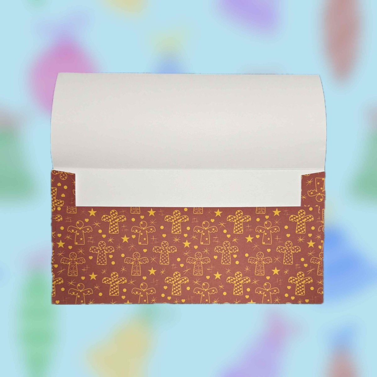 Darovací papírová ručně skládaná obálka s autorskou grafikou se zlatými andělíčky mezi hvězdami na cihlově červeném pozadí.