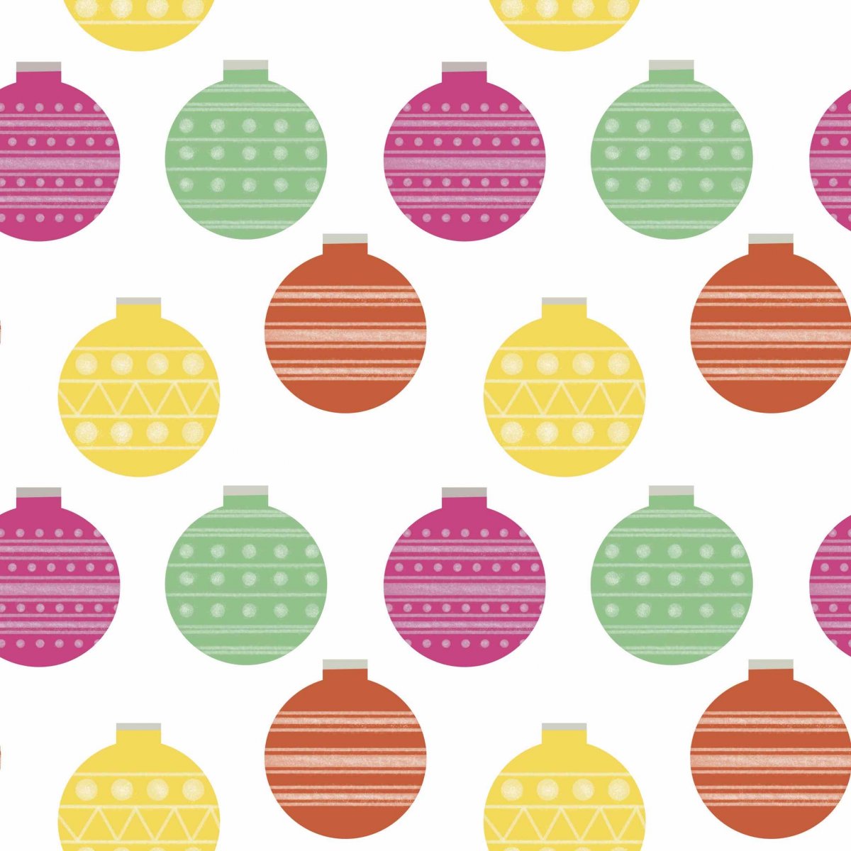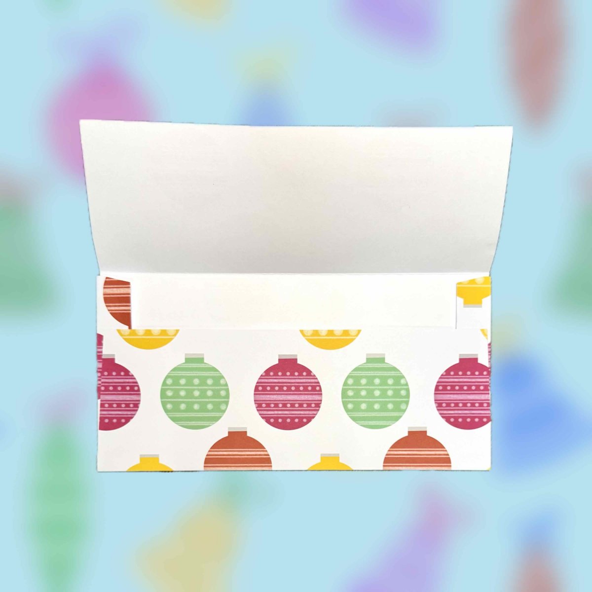Papírová darovací ručně skládaná obálka s potiskem autorskou grafikou s vánočními ozdobami - koule na bílém pozadí. Velký vzor. Obálka z bílého papíru gramáže 160 g/m2 s inkoustovým potiskem.